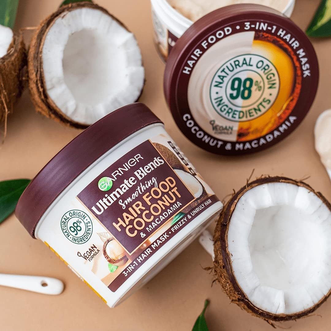Garnier Hair Food 3-in-1 Hair Treatment Mask, Smooths and Nourishes, For Frizzy & Curly Hair, No Silicones, Vegan Formula, Coconut Oil, Ultimate Blends, 400ml (Packing and Ingredients may vary)