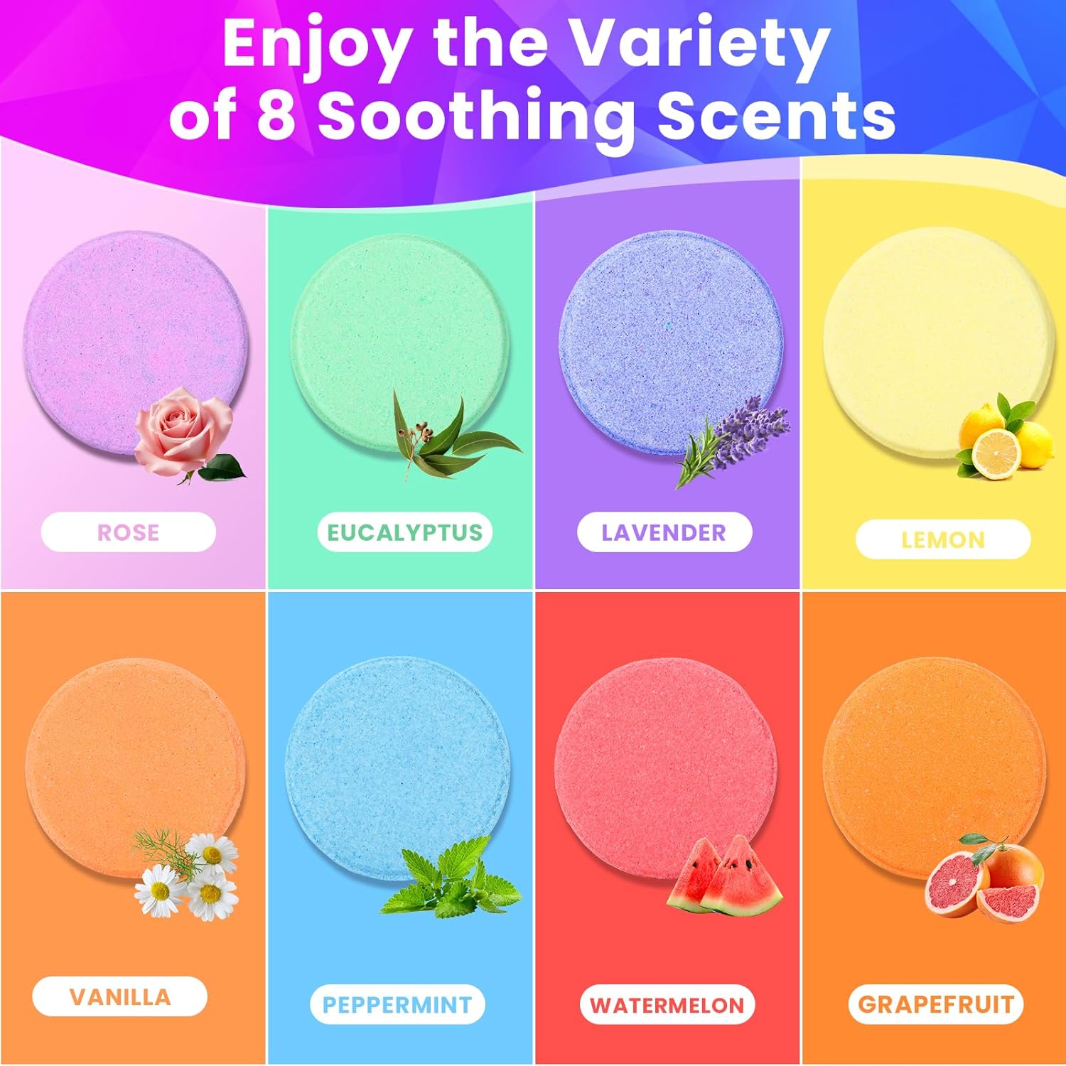 8 Scents-Sational: lavender, eucalyptus, peppermint, grapefruit, rose, lemon, watermelon, vanilla. Our shower steamers Aromatherapy release soothing scents that transform your shower into a calming oasis. Enjoy a relaxing, refreshing and stress-relieving experience every time you step into the shower. This is truly the best shower accessories ever and shower essentials.