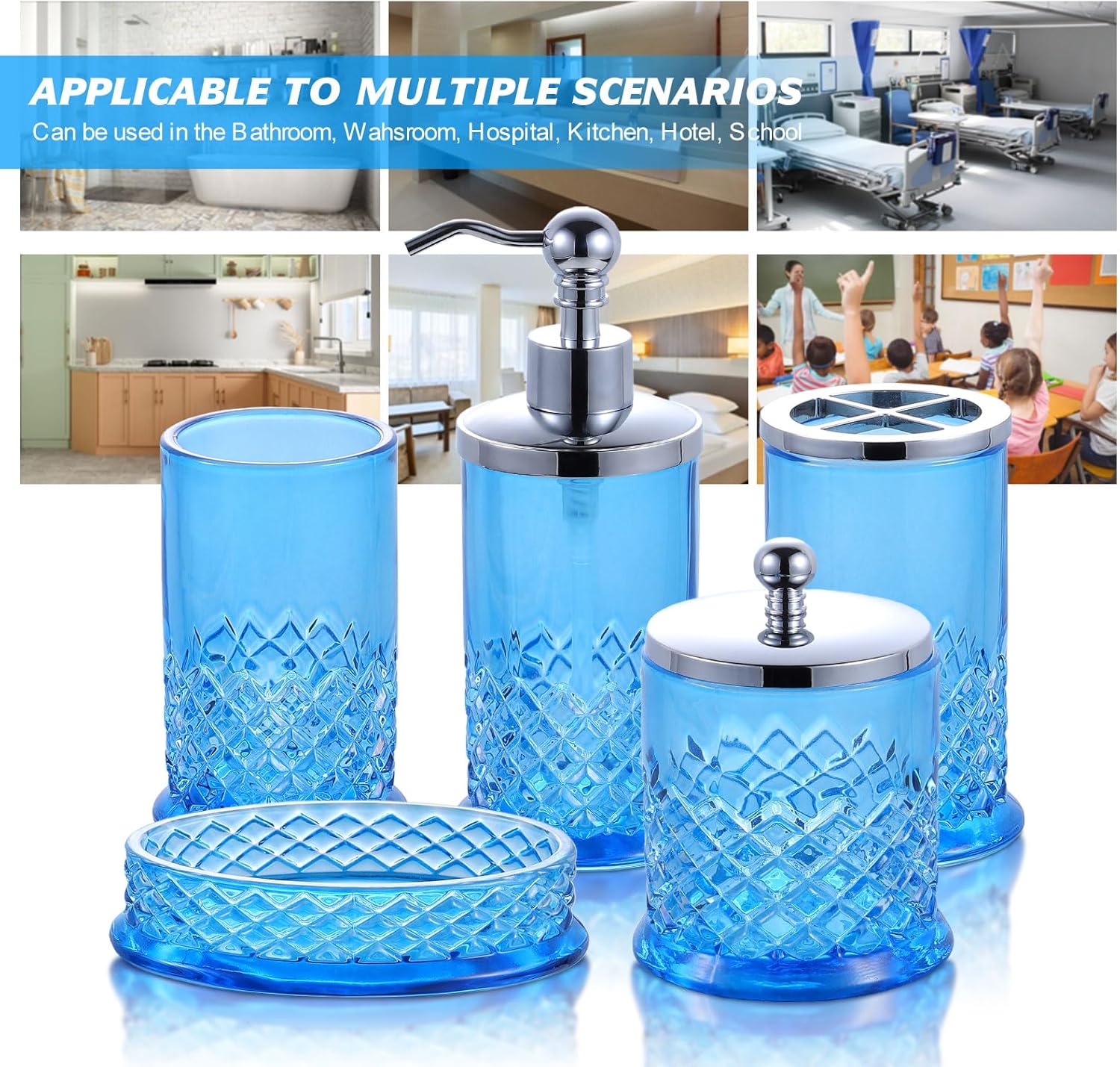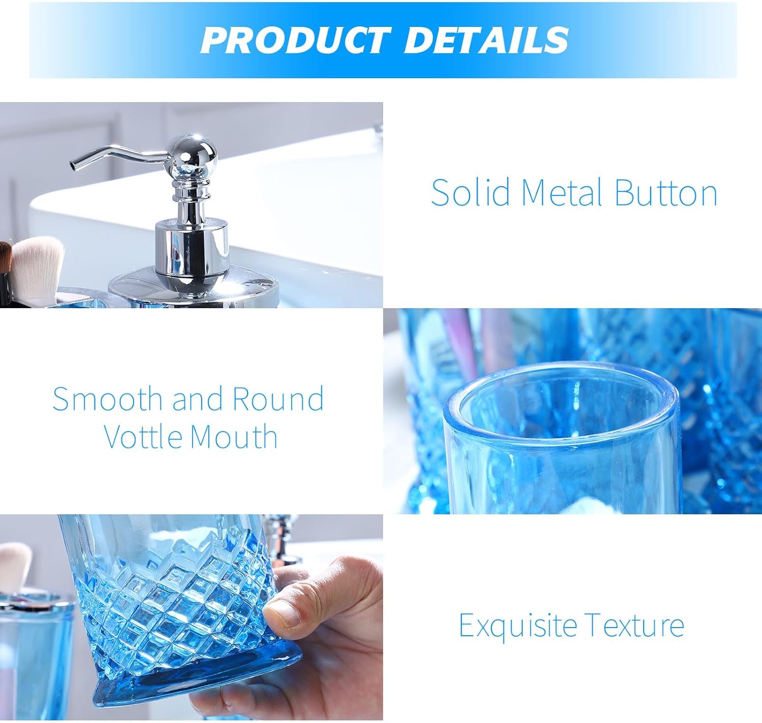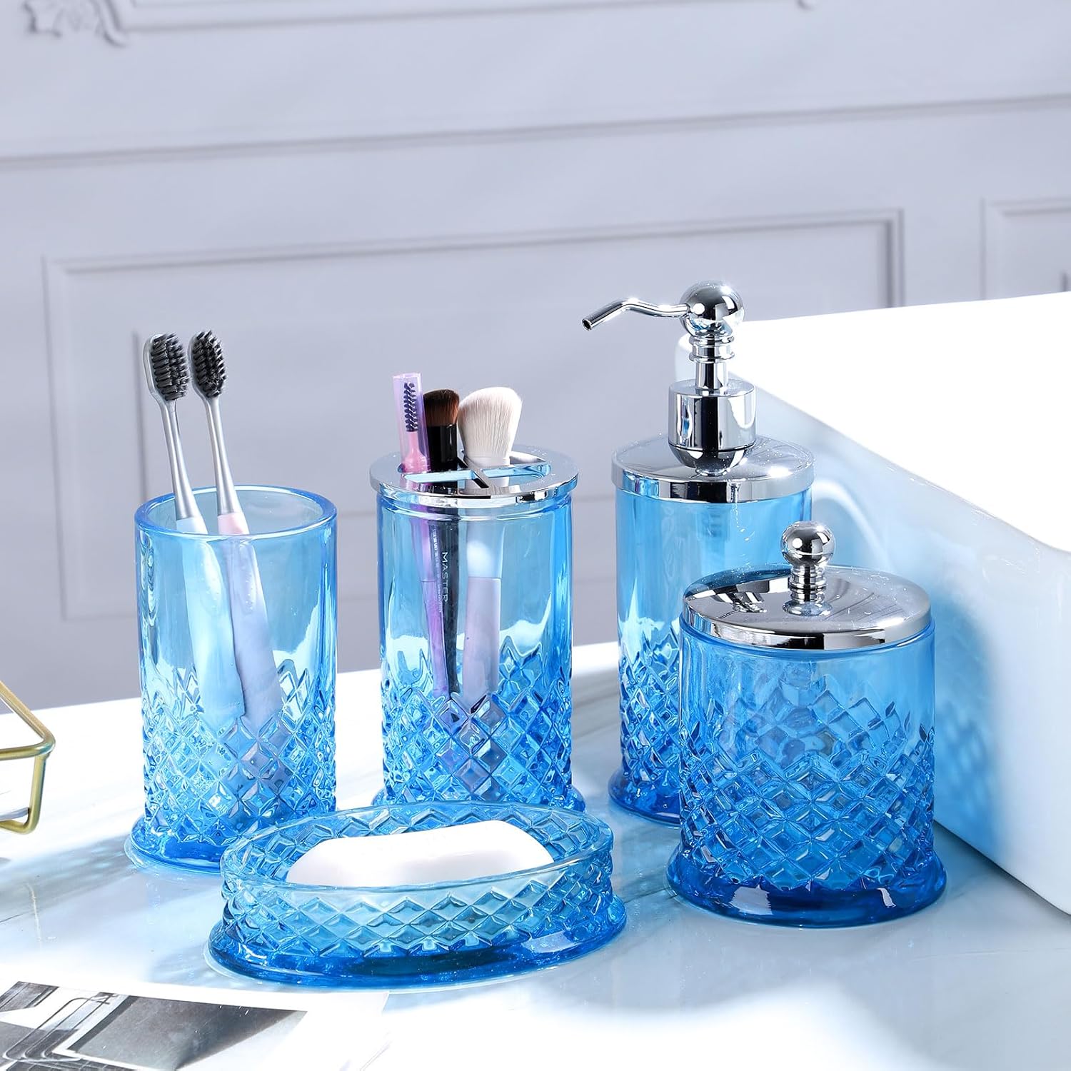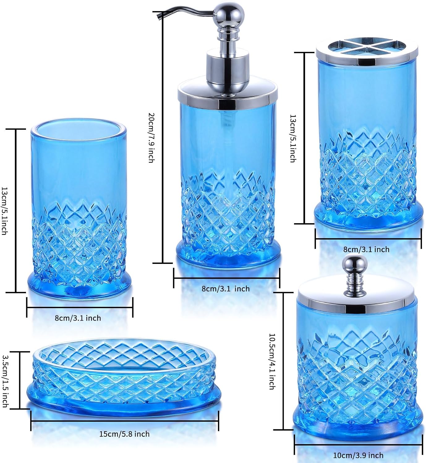 Glass Bathroom Accessories Set – Complete 5 Pc Glass Bathroom Accessory Set Includes Lotion Dispenser, Soap Dish, Toothbrush Holder, Tumbler, Cotton Pads Jars, Modern Bathroom Decor (Blue)