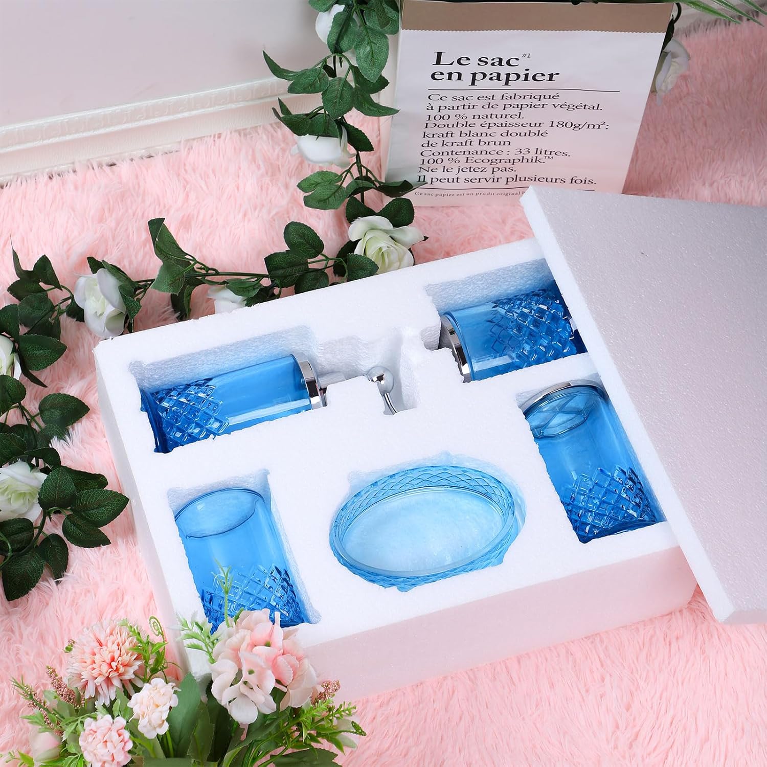 Be the first to review “Glass Bathroom Accessories Set – Complete 5 Pc Glass Bathroom Accessory Set Includes Lotion Dispenser, Soap Dish, Toothbrush Holder, Tumbler, Cotton Pads Jars, Modern Bathroom Decor (Blue)”