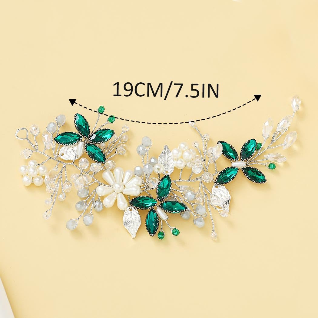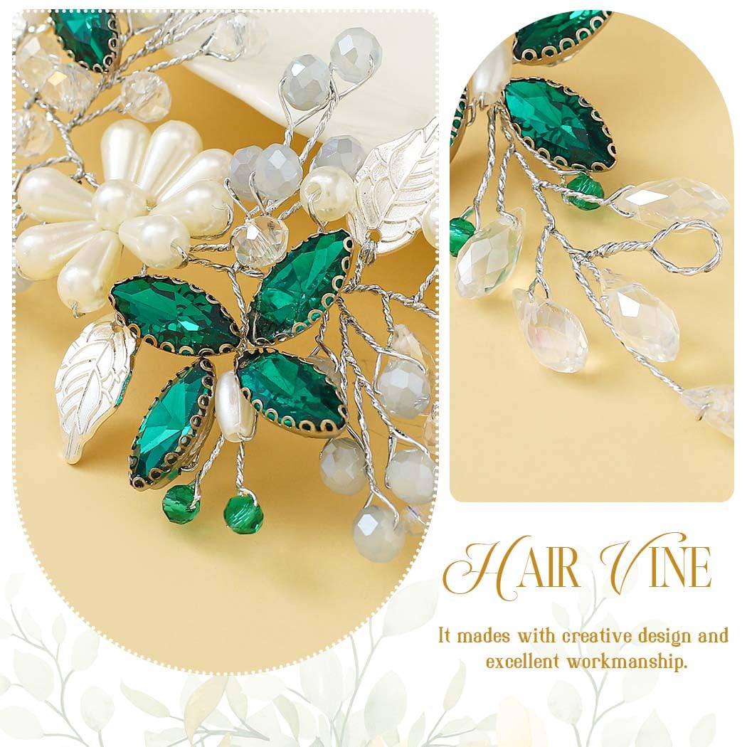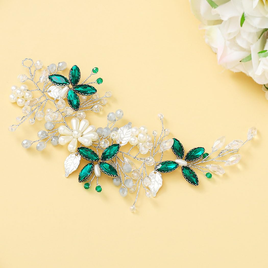 GORAIS Green Crystal Bride Wedding Hair Vine Silver Pearl Bridal Headpiece Rhinestone Hair Piece Butterflies Hair Accessories for Women and Girls