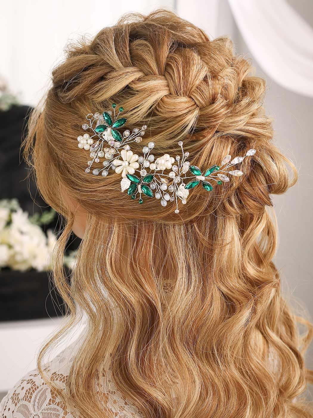 Wedding hair accessories are made of silver alloy wire, leaves, beads,pearls and green crystals. Green crystals seem to dazzle like jewels, setting off a noble and elegant temperament that easily catches people’s attention.