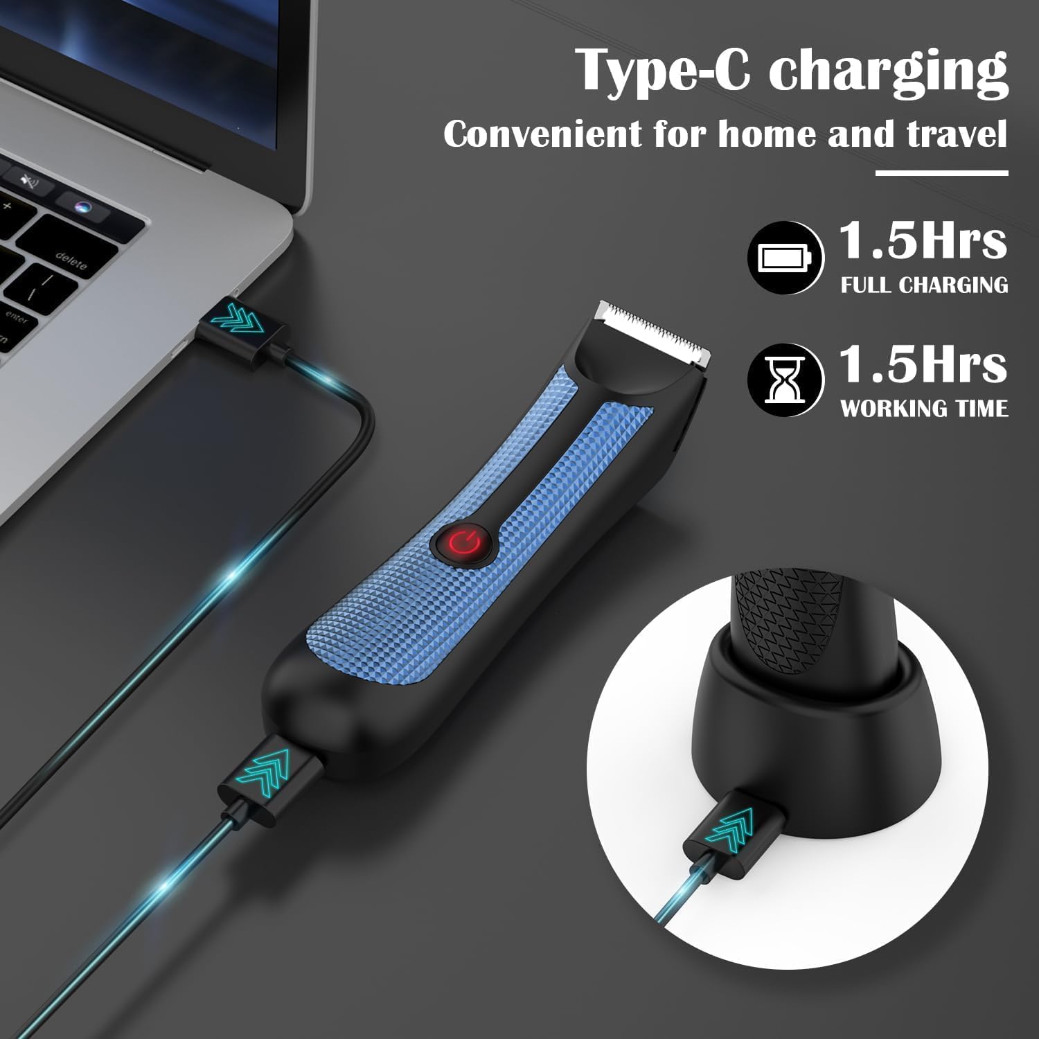 Rechargeable Groin Trimmer: Designed for convenience, the pubic hair shaver features USB charging for easy portability and use on the go. Just charge for 1.5 hours to get 90 minutes of shaving time.