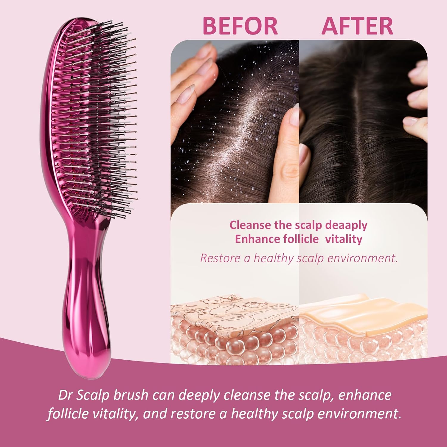 Scalp Massager: 3 different hardness levels and varying bristle heights can stimulate the scalp, enhance follicle vitality, and restore scalp health.
