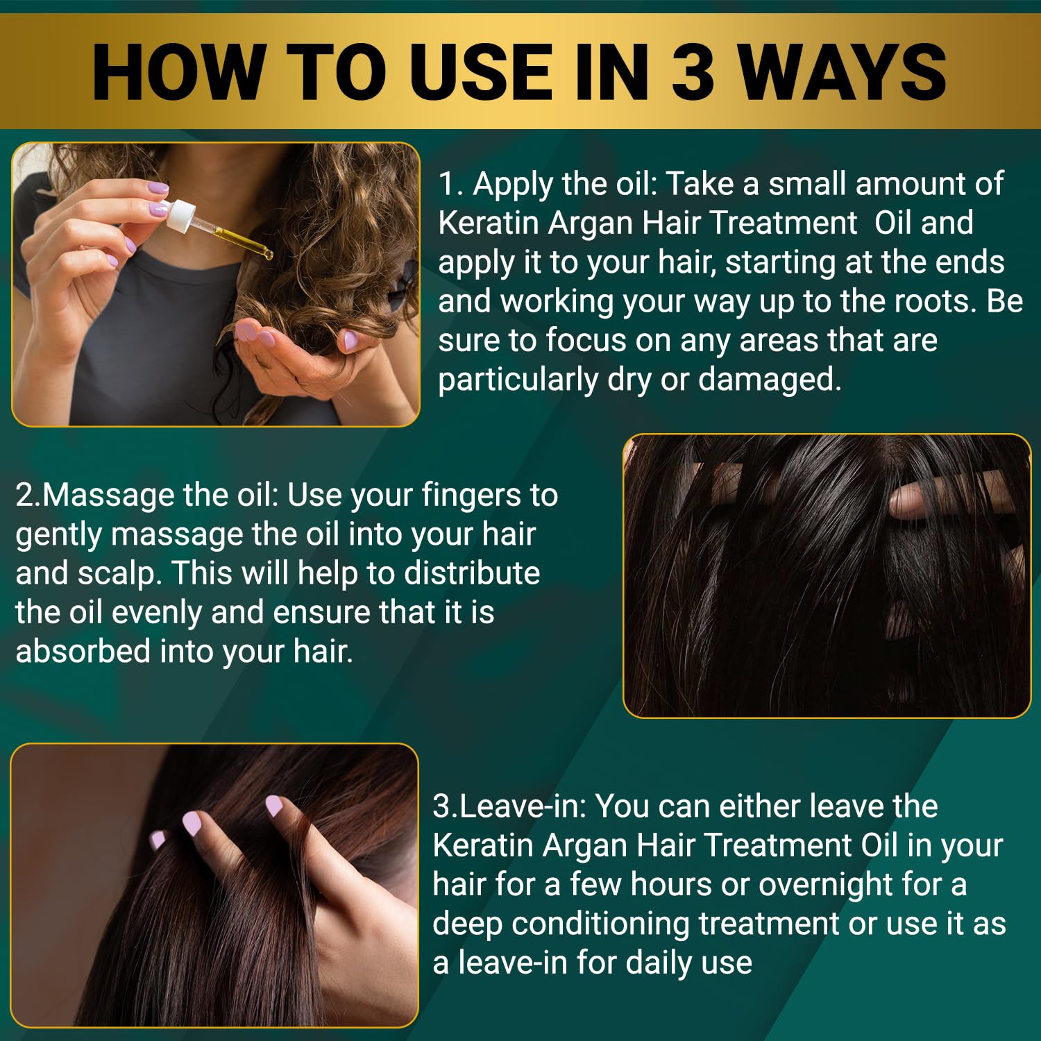 ALL-IN-ONE Hair Oil Treatment: Heat Protector, Styling, Restoring Care. Use as a leave-in styling treatment, apply the Hair Oil to damp hair from ends to roots, avoiding your scalp, blow dry or air dry your hair and style as usual. As a deep treatment to strengthen and repair, a few drops on lengths or ends before bedtime. As a Hair Growth Support, apply argan oil to the ends of your hair, massage the oil evenly from the middle of your hair to the ends -20 minutes to an hour and then wash out