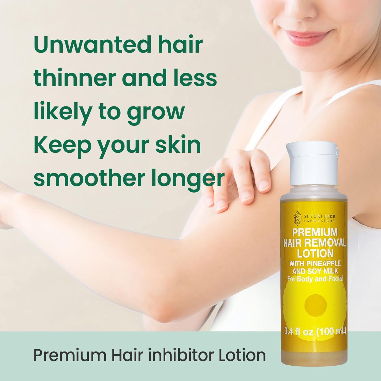 Premium Hair inhibitor lotion with Pineapple and Soy Milk: Contains soybean extract and iris extract, which act like female hormones to inhibit hair growth. Continued application makes unwanted hair thinner and less likely to grow.