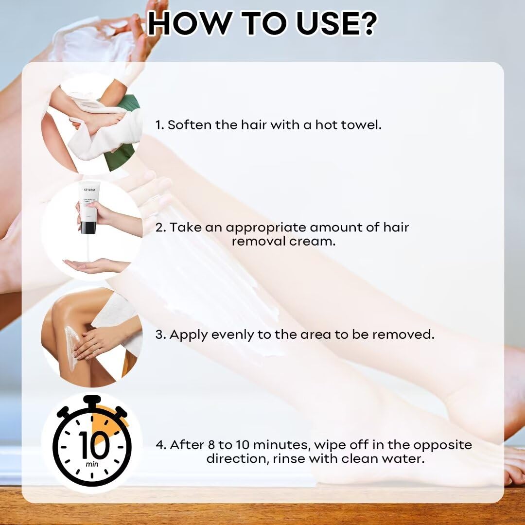 Quick & Painless Hair Removal: Achieve fast hair removal in 8-10 minutes with SYABO hair removal cream. SYABO hair removal cream boasts a hair removal rate of up to 99.8%, making hair removal at home easy and efficient. Suitable for use on areas of the body where hair is not desired, such as the bikini area, arms, legs and underarms, etc. Note: Not recommended for use on the face.