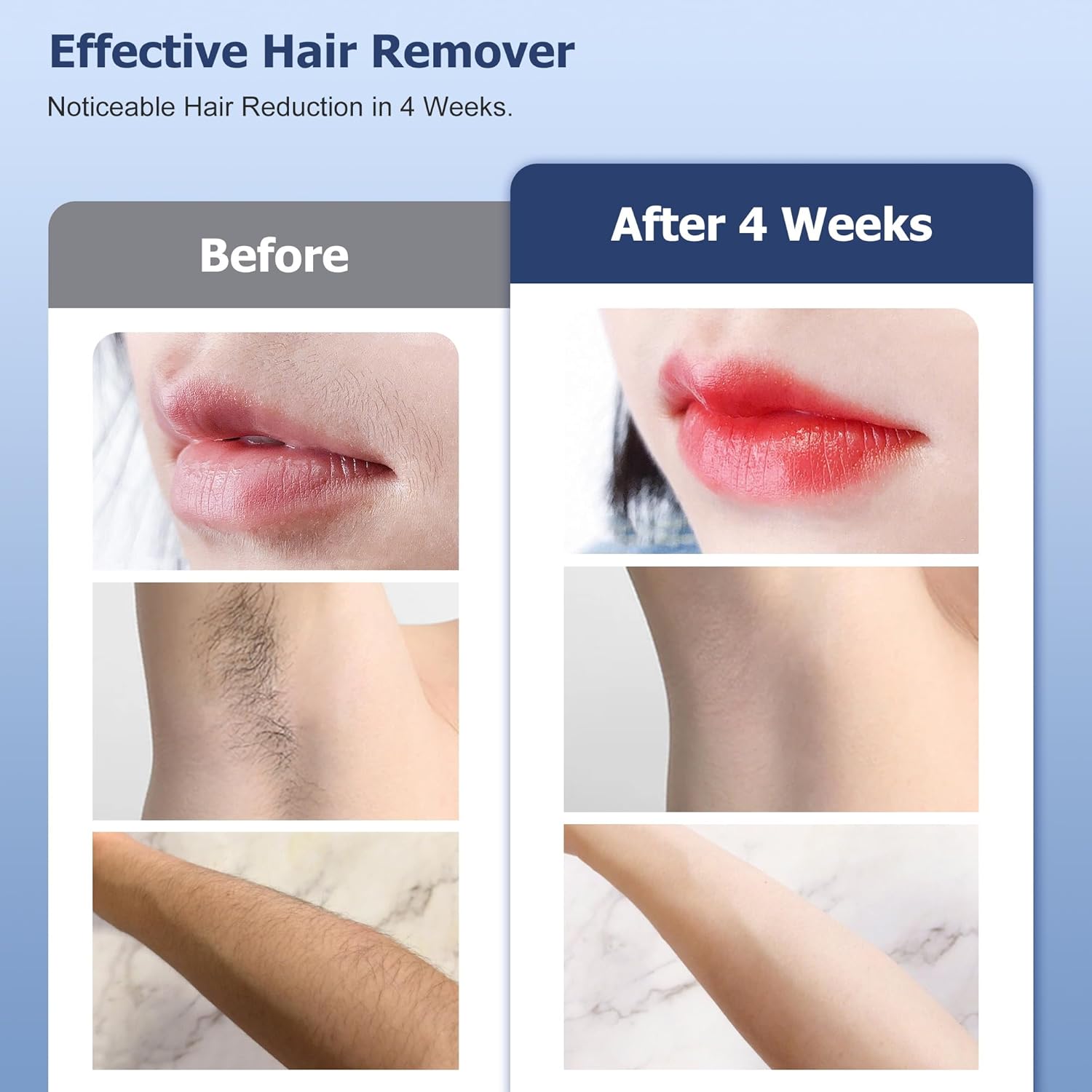 Follow the right steps for hair removal. Insist on using hair removal device periodically, Because hair follicle has a growth cycle, Use it periodically to deactivate hair follicles, Hair grows less and less. achieve permanent hair removal.