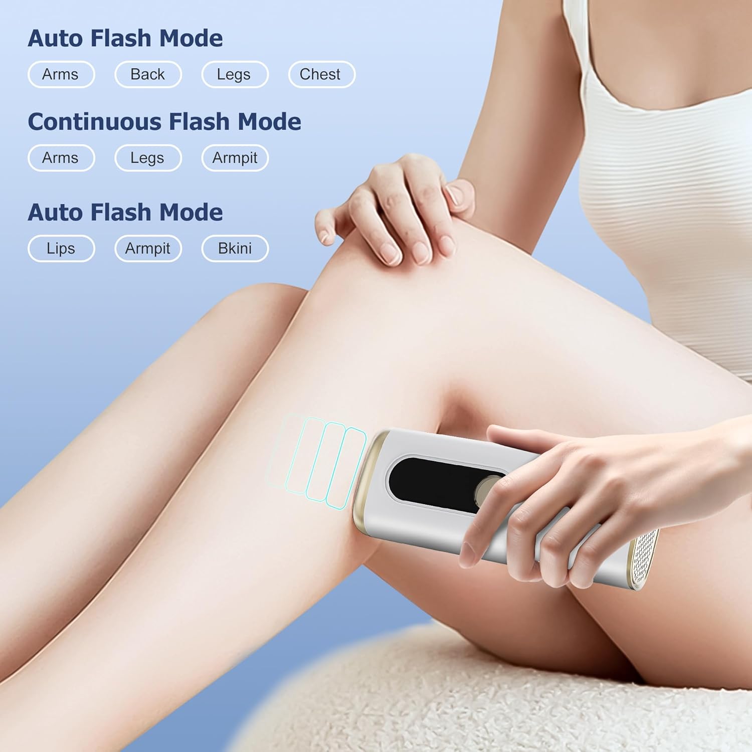 [Auto, Continuous, Manual Mode] GeeSoul permanent facial hair removal for women designed with 3 working modes, auto, continuous and manual working mode. Different skin areas and different hair growth rates, which provide you with a more precise treatment. Great for Arms, Back, Legs, Chest based on Auto Flash Mode; Great for Arms, Legs, Armpit based on Continuous Flash Mode; Great for Lips, Armpit, Bkini based on Manual Flash Mode.