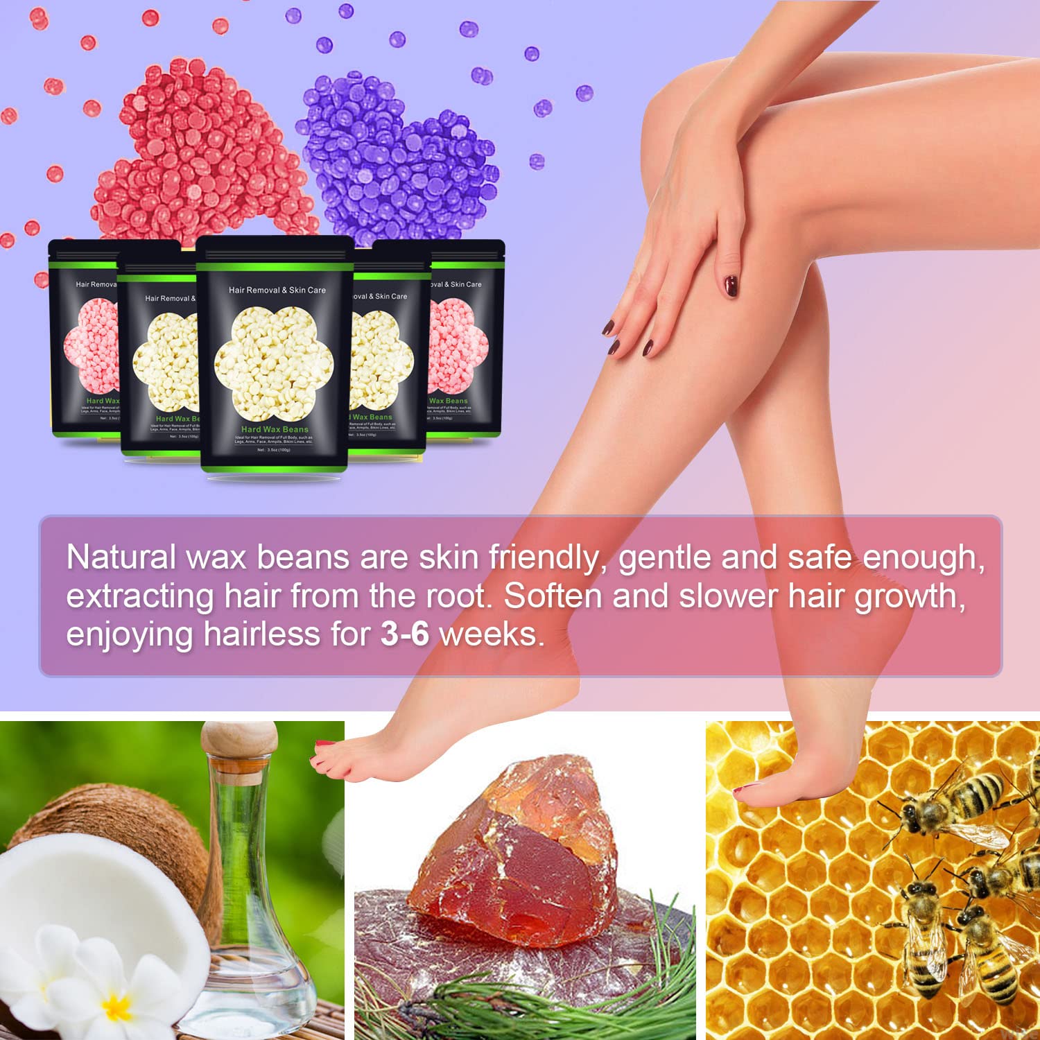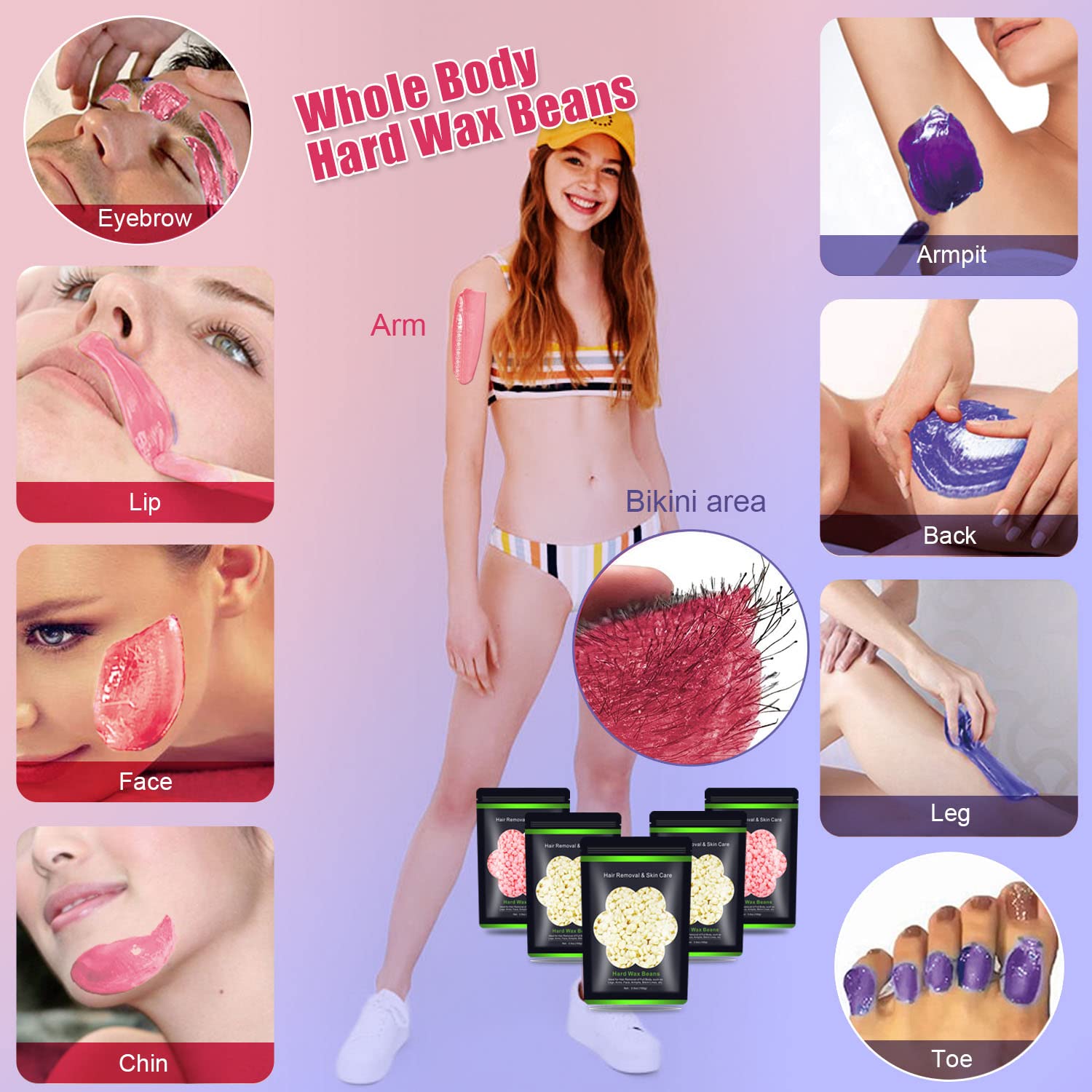 Hard Wax for Hair Removal Meet Your Request of Remove Hair: The wax bean kit offer 5 packs of various colorful flavor pearl waxing beads (Chamomile, Rose, Cream, Lavender etc) for your home waxing. Pearl wax beads work on chin, chest, bikini line, legs, feet, nose and eyebrow etc. make you enjoy nearly pain-free, stripless flawless hair removal, you can achieve smooth and hairless skin in minutes with less discomfort. Our bikini wax beads are the perfect refill for any wax warmer.