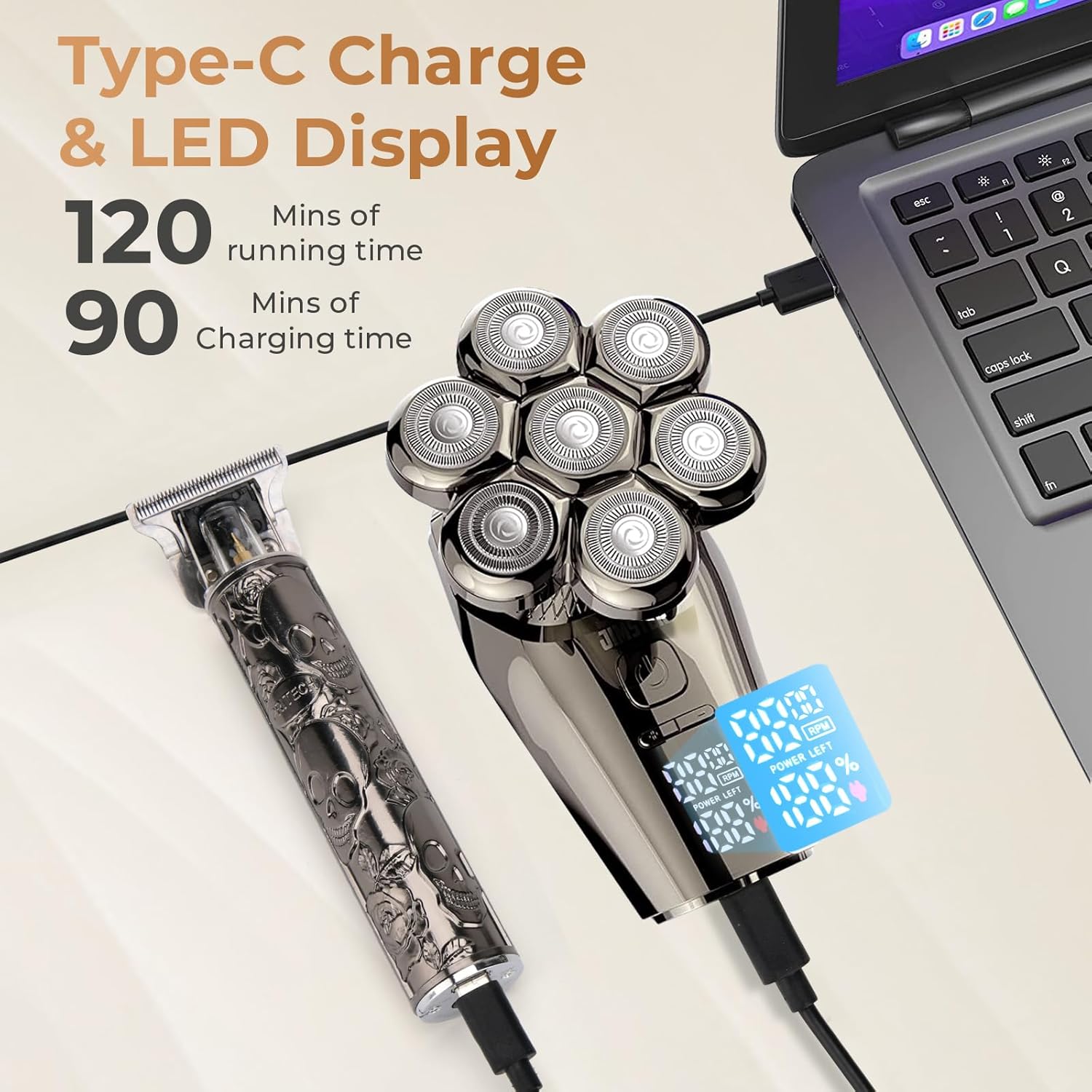 【Type-C Fast Charging & LED Display & 3 Speed Settings】:The head shaver is upgraded with 3-level shaving speeds(6500-7000-7500) to meet your different head razor needs.Cordless mens head razor with a built-in battery offers 120 minutes of working time after 1.5 hours of fast charging. The bald head shaver for men with LED display can accurately show the percentage of the battery power, Low battery reminder, water washing reminder,suitable for home /travel use.