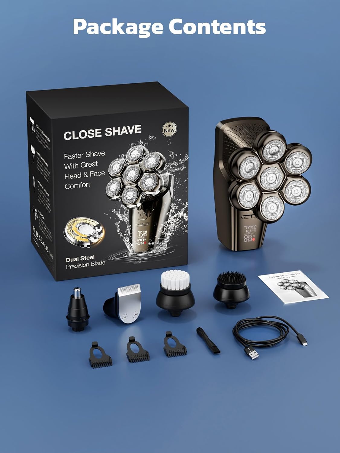 【Upgraded 7D Head Shaver】Featured 7 floating heads and double ring blades increasing the shaving area and saving time. 7D precision floating head and rounded edges move smoothly across the skin, better fit for different head shapes, with a premium motor to ensure a quick, smooth, and close shave, avoiding hurt on the head skin, and giving you a more comfortable and efficient shaving experience.