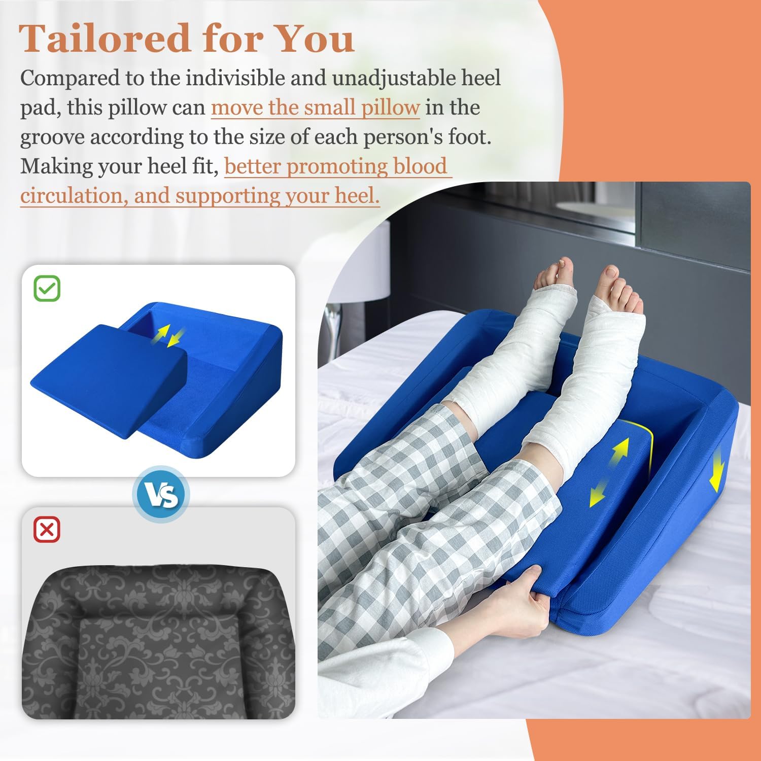Compared to the indivisible and unadjustable heel pad, this pillow can move the small pillow in the groove according to the size of each person’s foot.Making your heel fit, better promoting blood circulation, and supporting your heel.
