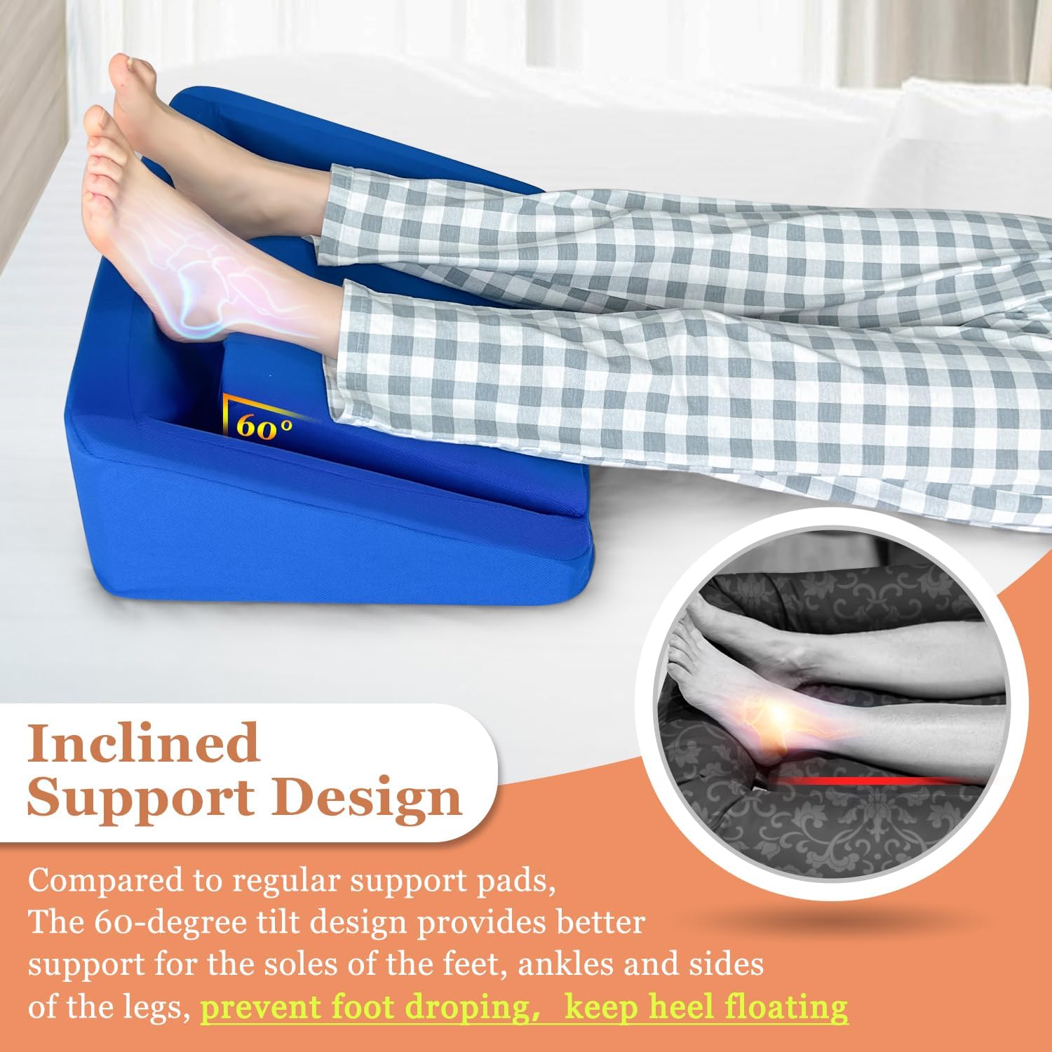 Compared to regular support pads,The 60-degree tilt design provides better support for the soles of the feet, ankles and sides of the legs,prevent foot droping,keep heel floating.