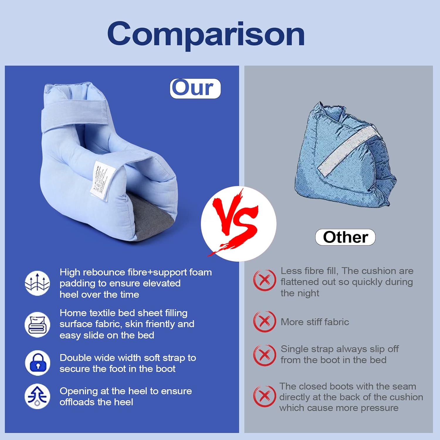 Special Design of EZ Assistive Heel Pillow :Open heel design effectively eliminates pressure induced to heel by suspending heel in the air, and also promotes faster healing.It is the best choice as heel protectors for pressure sores.