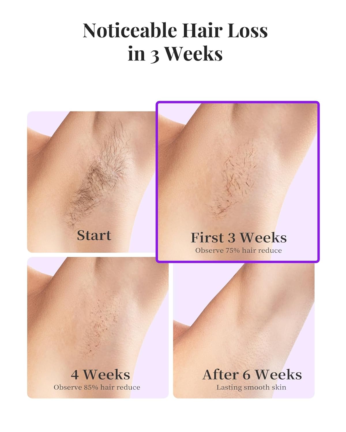 8 Weeks Results: Hikyskin laser hair removal device works directly on the hair follicle, you can see a significant reduction in hair loss within four weeks after treatment, hair regrowth slows down. In most cases, hair loss can be as high as 94% after 7-8 weeks of consistent use.
