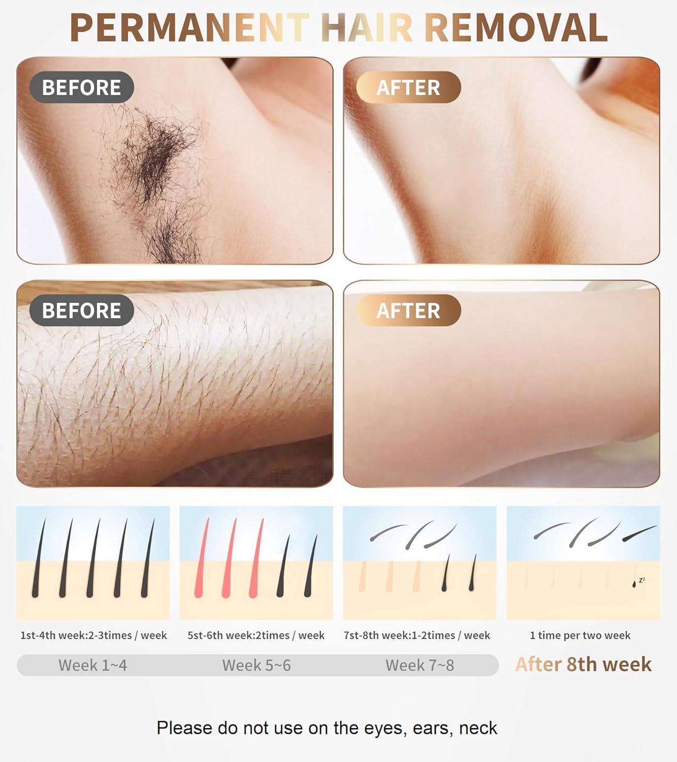 Permanent Hair Reduction: Effectively reduces hair growth over time with continued use, treatments needed every 6-8 weeks to target remaining hair follicles for long-lasting smooth skin.