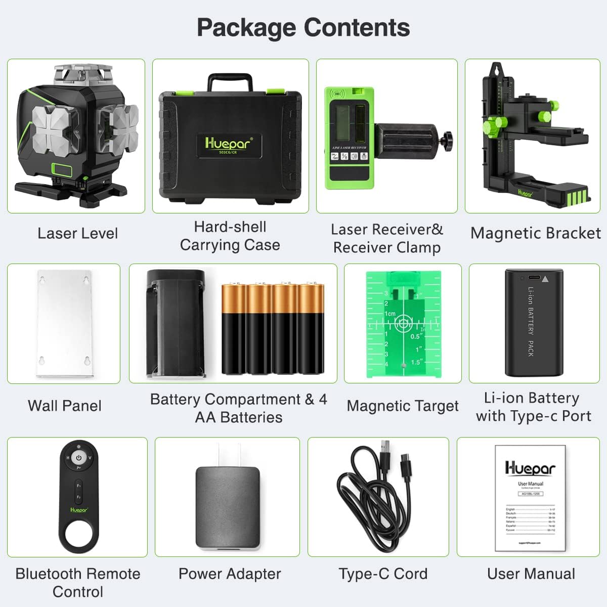 1 x 4D Green Tiling Laser Level with LCD screen S04CG1 x Huepar LR-5RG Digital Laser Detector & 1 x Heavy-duty Receiver Clamp1 x Bluetooth Remote Control1 x Rechargeable Li-ion Battery1 x Power Adapter& Type-C cord2 x AA Batteries for Receiver4 x AA (LR6) Batteries & 1 x AA Battery Holder1 x Magnetic Bracket & 1 x Steel Sheet1 x Laser Target Plate &1 x Hard Carry Case1 x Lase Level User Manual