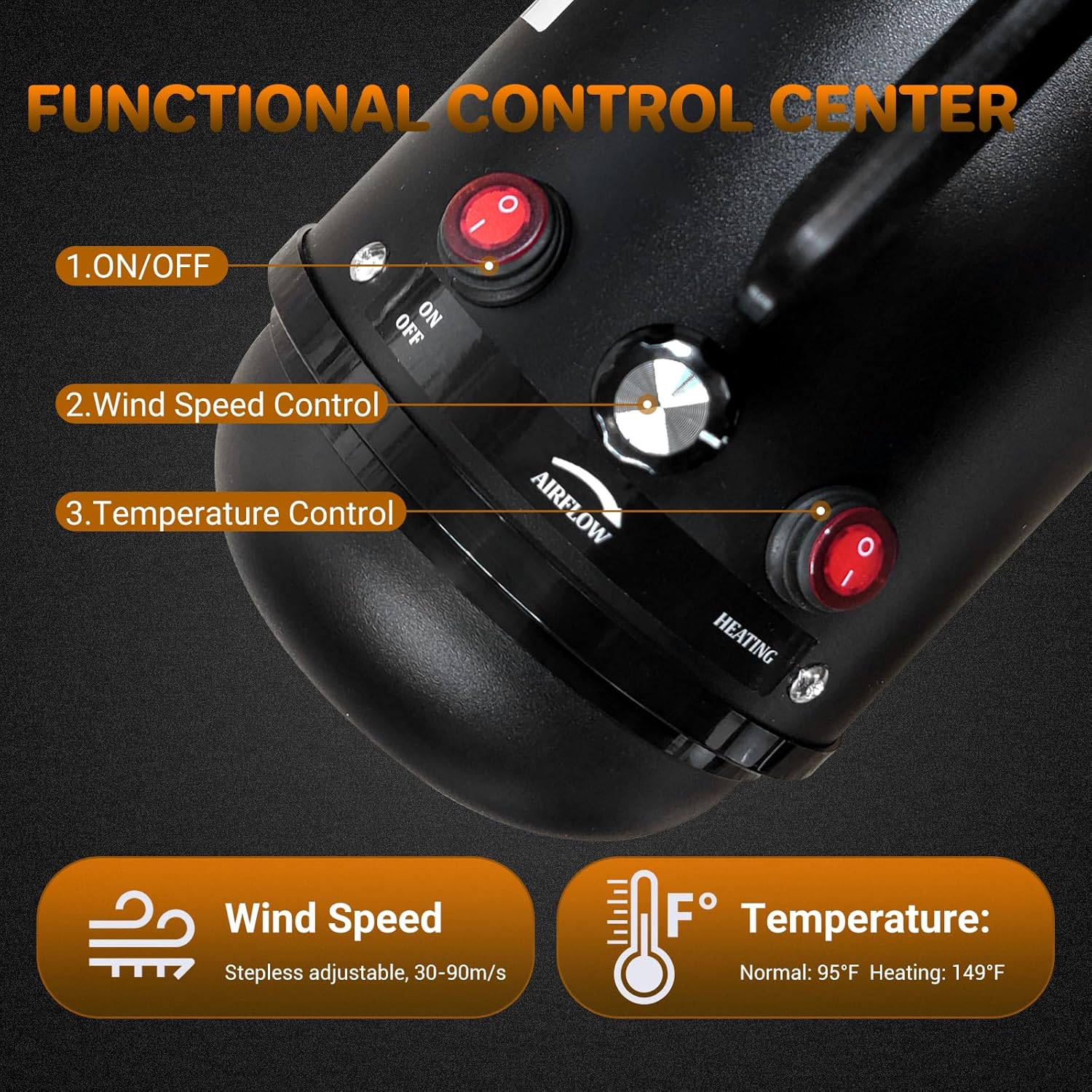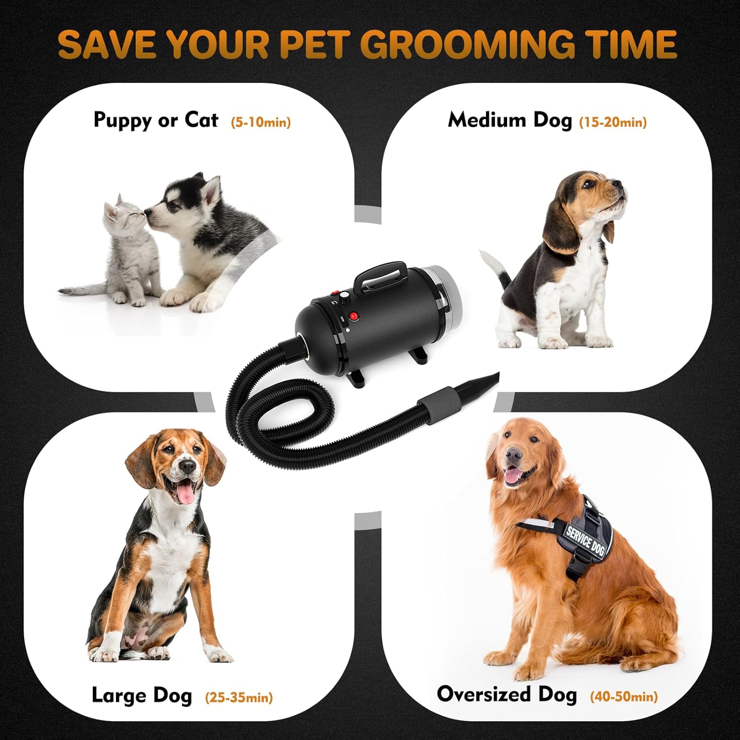 【Adjustable Airflow Speed & Temperature 】The dog grooming dryer has a steplessly adjustable airflow speed of 30M/S-90M/S, and two adjustable temperatures of regular 95 °F and heated 149 °F. You can choose the appropriate wind speed and temperature for your pet. If you want your pet’s hair to dry faster and cause less damage, this dog dryer will provide you with great help.