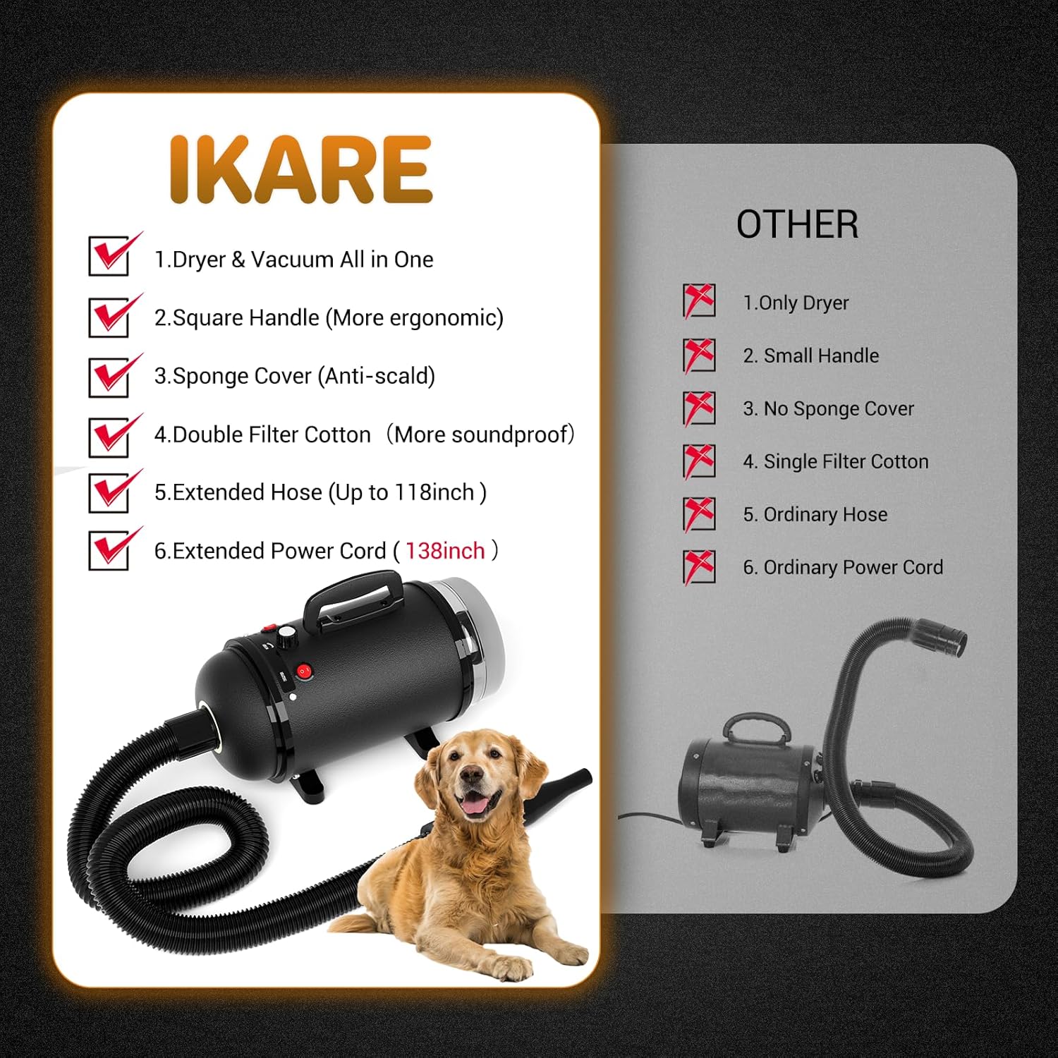 IKARE Dog Hair Dryer & Dog Grooming Vacuum, 5.2HP/3800W High Velocity Pet Blower Dryer with Adjustable Speed and Temperature Control, Force Dog Grooming Dryer with 4 Nozzles, 1.2L Dust Cup Capacity