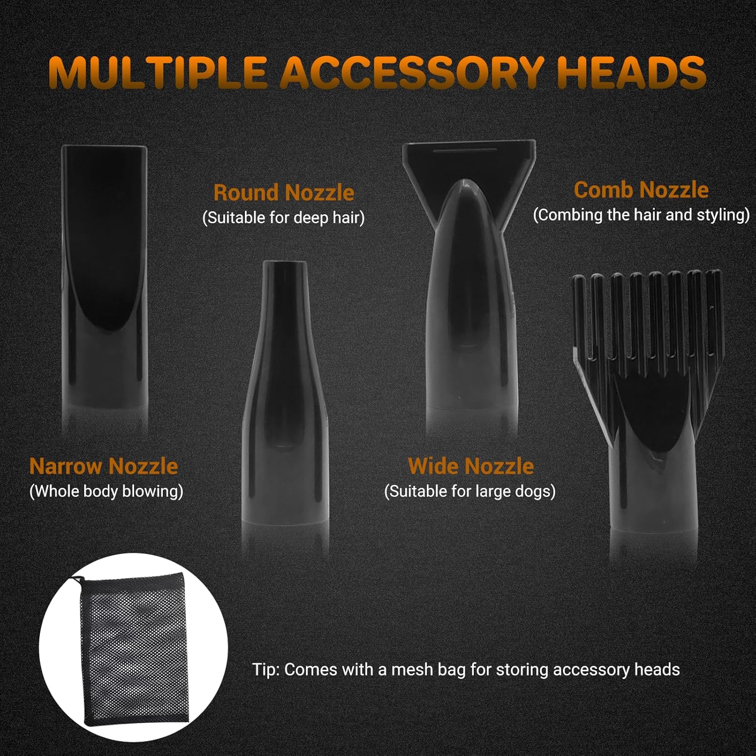 【4 Nozzles & Storage Bag】Our dog blow dryer is equipped with 4 different nozzles to meet all drying needs and create different shapes for your adorable pet. In addition, we present you with an accessory mesh storage bag, which is convenient for storing nozzles and not easy to lose and scatter. It is undoubtedly the best choice for professionals and families!