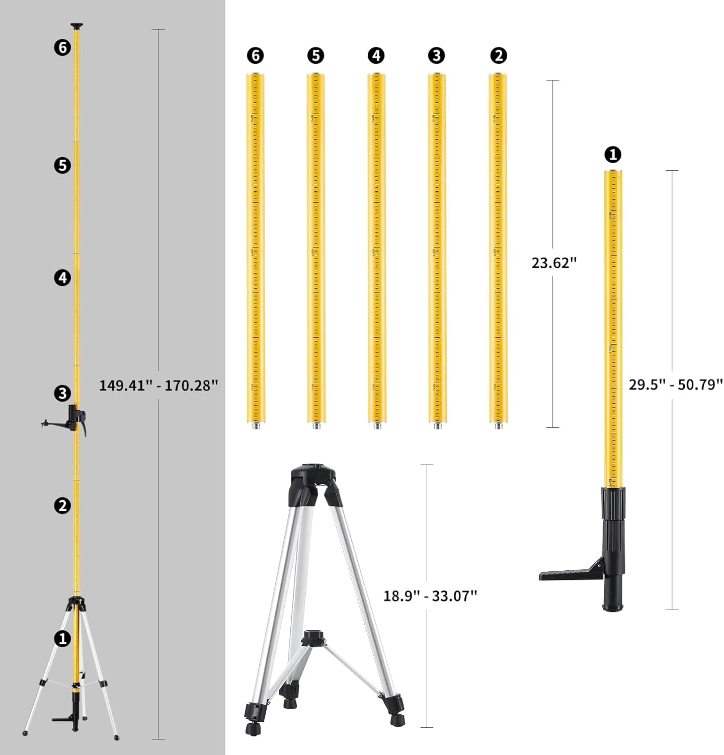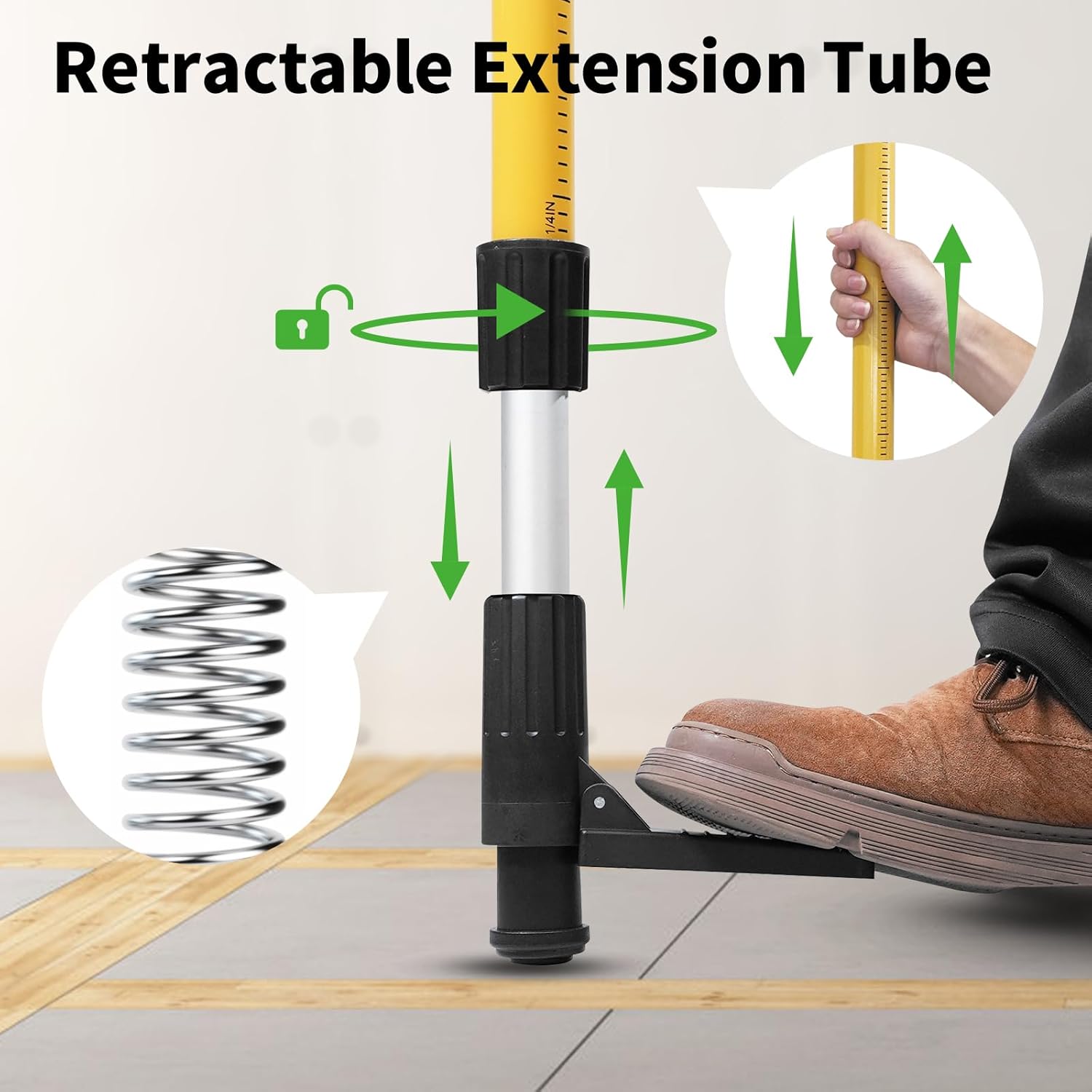 🔧【13.8Ft Telescoping Pole】The IKOVWUK adjustable laser level tool mounting pole has a total length of 13.8 ft/4.2m. It consists of 5 telescopic rods and 1 telescopic tail rod, allowing you to adjust the height according to the floor height and meet your various needs.