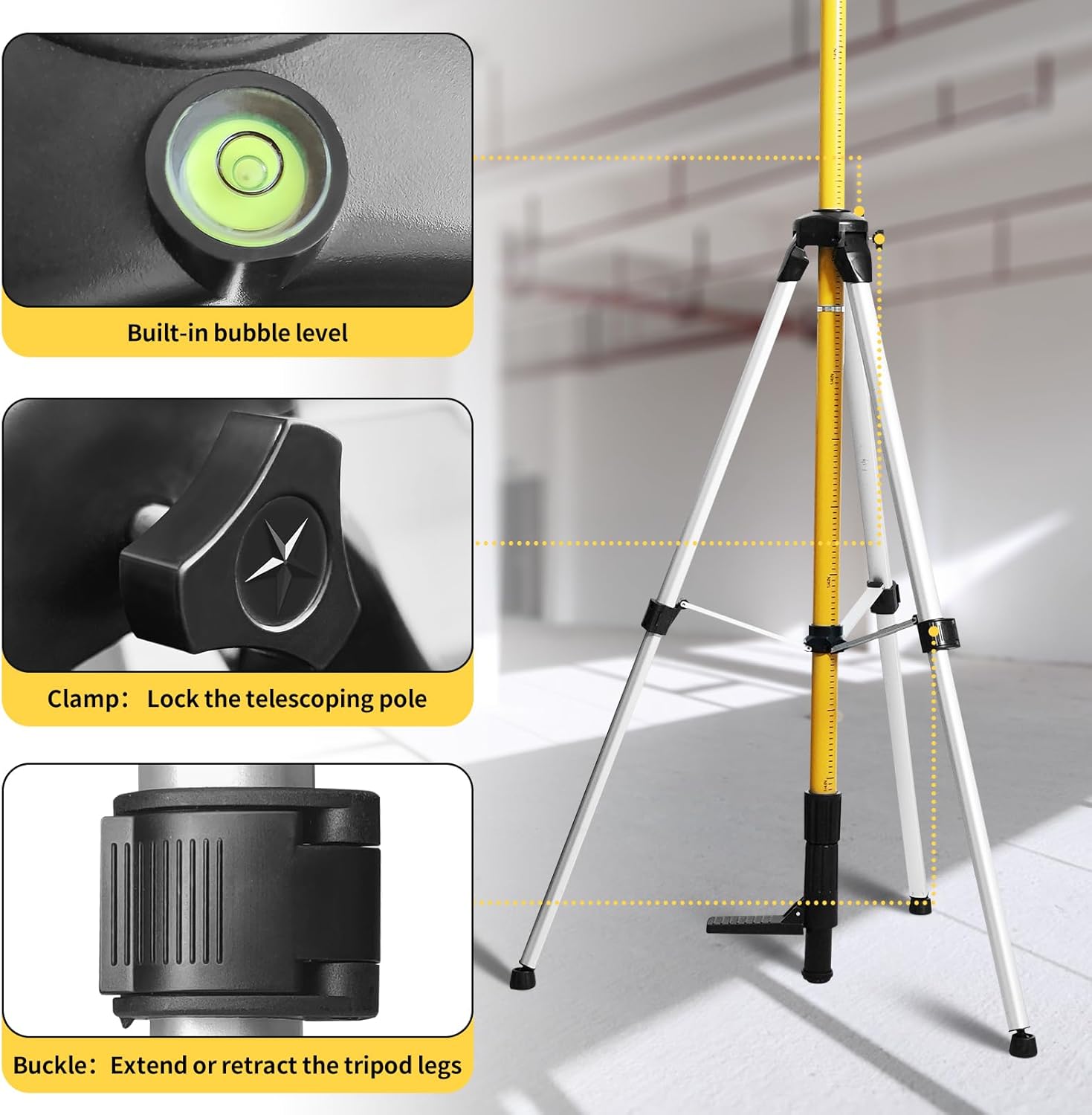 🔧【Multiple Placement Methods】This level tool comes with a retractable tripod. When you need to use it at a higher place, the tripod provides stability to the pole. Alternatively, you can use just the pole itself. The ceiling head securely holds the rods in place and protects both the rods and the ceiling.