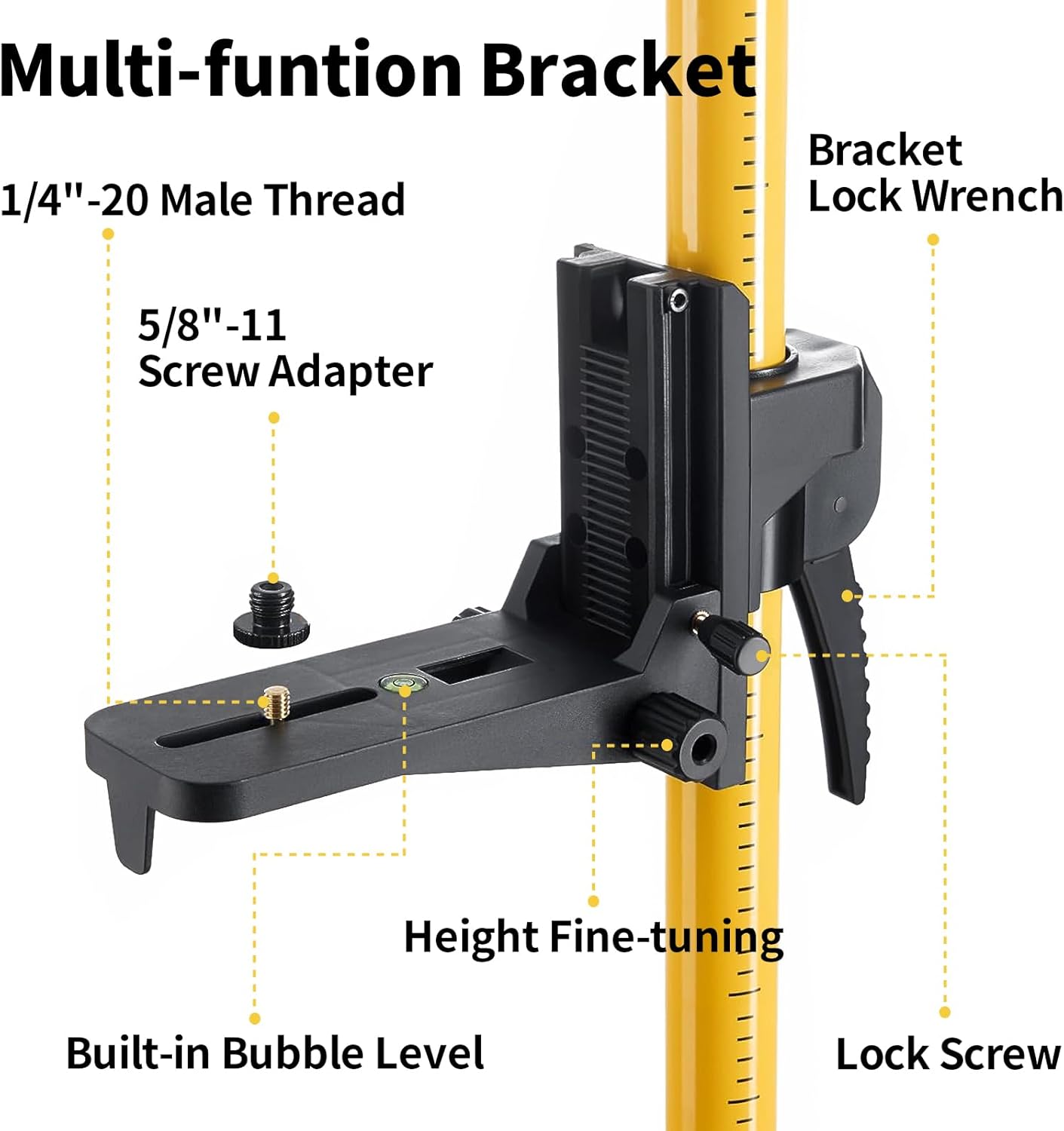 🔧【Fine-tuning Bracket】The bracket features a 1/4″ thread and a 5/8″ thread adapter, making it compatible with most laser levels. With its adjustable design, you can position the bracket at any desired height. The fine-tuning knob allows for precise adjustments within a height range of 2.7″, a depth of 2″, and 360° rotation.