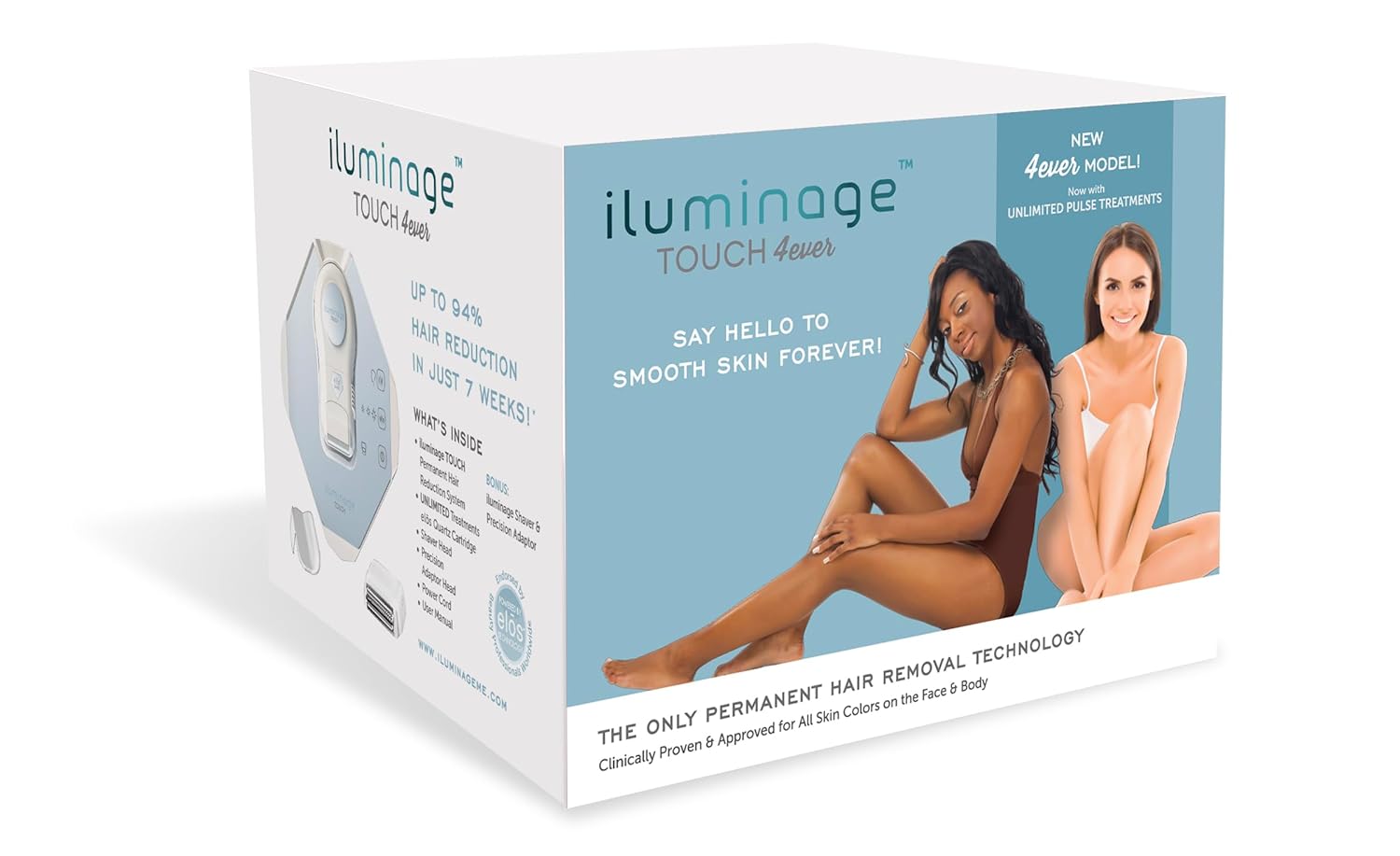 PERMAMENT RESULTS IN TWO WEEKS: iluminage Touch Hair Removal Device is the most effective at-home hair removal device on the market today that is clinically proven to permanently remove unwanted body and facial hair on all skin colors and on the widest range of hair colors in just two weeks. SUPERIOR, SAFE & PROVEN TECHNOLOGY: Powered by superior, safe and proven Elos patented technology that has been used safely and effectively in the professional medical industry for over 20 years by beauty professionals worldwide. PROVEN RESULTS: Up to 94% hair reduction in 7 weeks and 46% of all hair removed after just two treatments. PEOPLE OF ALL SKIN COLORS CAN USE IT: Only professional permanent hair reduction at-home system that is approved and safe for use on people of all skin colors: from light, fair, medium skin to olive, brown and the darkest brown colors. No other hair removal device brand is approved or safe for use on darker-skin colors. ALL HAIR COLORS: Clinically proven to be safe and effective on the widest range of hair colors, including white, gray, blond, red, brown, black, and other hair colors. FAST TREATMENT: The large treatment surface and fast light pulses provides you the shortest treatment times, with each leg done in 10 minutes, under-arm done in 1 minute, each arm in 3 minutes, bikini in 2 minutes, face in 2 minutes, male back done in 12 minutes, male chest in 10 minutes, abdomen in 5 minutes, and an entire full body treatment done in 32 minutes. SAFE: Safe and effective with no pain, irritation, discomfort, nicks, cuts, stinging, razor burn, or other side effects experienced with shaving and waxing. UNLIMITED PULSES: The new Touch 4ever model features unlimited pulses so you can enjoy a lifetime of treatments without needing to spend more money on replacement cartridges which is needed with other hair removal brands. ELOS TECHNOLOGY: Powered by patented Elōs technology that is used in professional machines used by doctors, the iluminage Touch features Intense Pulsed Light (IPL) to work quickly and gently to disable hair follicles so that hair falls out and does not grow back. Developed by the scientists who invented the hair removal standard IPL, this unique combination of IPL and other technologies delivers unprecedented safety, speed, and effectiveness. FREE SHAVER HEAD & PRECISION ADAPTOR: Your iluminage Touch set comes with a shaver and precision adaptor – free. iluminage Touch is the only platform device on the market, enabling you to use the device as shaver by switching out your hair removal cartridge and placing a shaver head. Additionally, a precision adapter head is also available which can be used with the device to deliver targeted pulses of energy in small and hard-to-treat areas such as the face, underarm, bikini area or around tattoos or moles. SAVE TIME & MONEY: Iluminage Touch saves you time and money and enables you to enjoy the benefits of permanent hair removal from the comforts of your home without needing to have frequent costly treatments at the spa or aesthetician office.