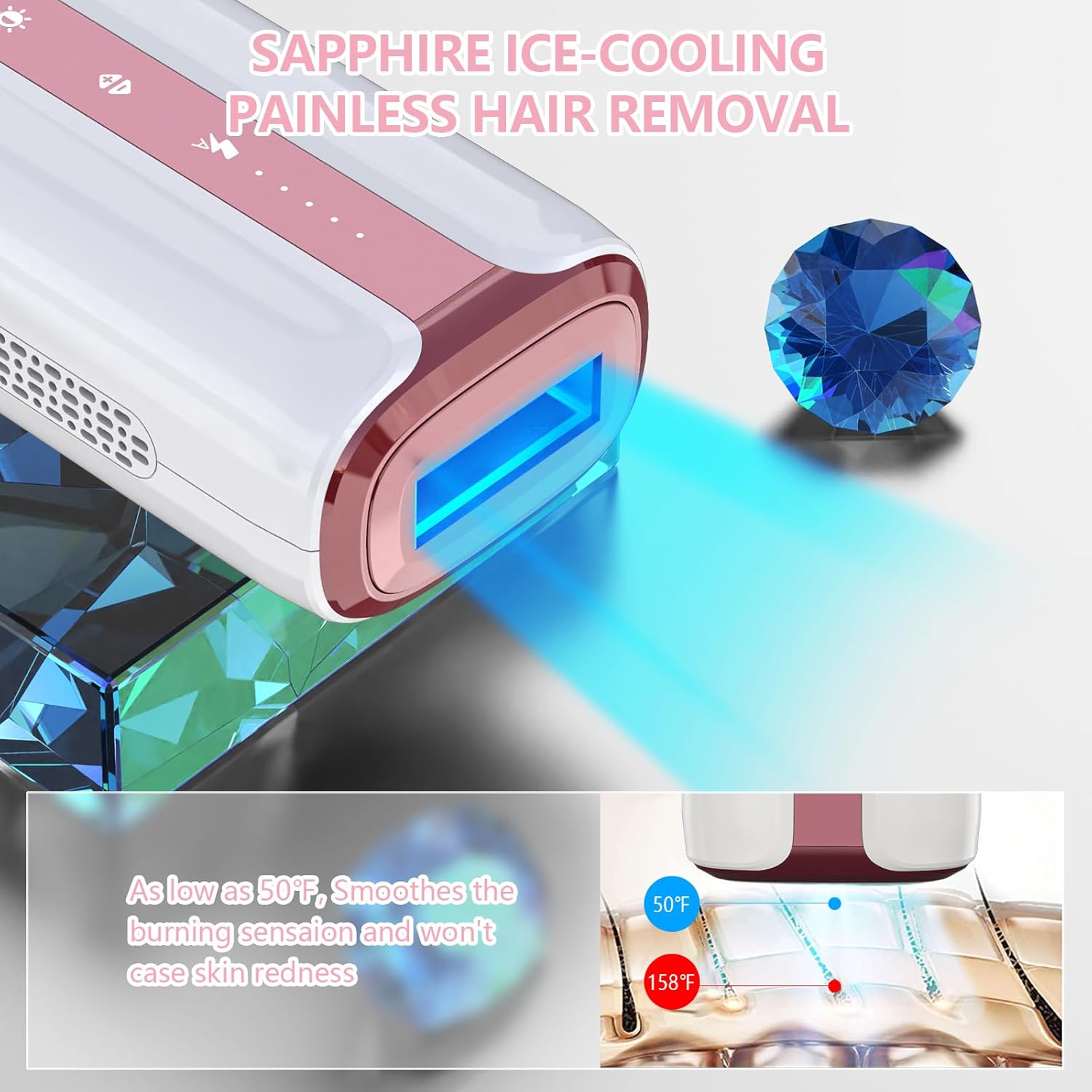 UPDATED SAPPHIRE ICE COOLING SYSTEM: Jitesy ipl hair removal is upgraded with clinical-grade sapphire ice-touch technology to lower the temperature from 158℉to 46℉(8℃). This makes hair removal painless. Sapphire cooling system achieves the effect by cooling the light source but other normal ice cooling system achieve the effects by cooling the hair removal device’s probe. So our ipl hair removal machine is safer and more effective. Even the most sensitive areas are safe to use.