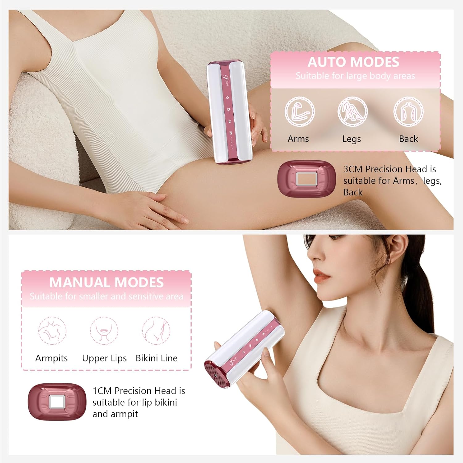 MULTI-FUNCTIONAL: 1) 3 in 1 function, this hair removal for women Integrating Hair Removal, Skin Care and Acne Clearance function together, it allows you to achieve skincare benefits while hair removal. 2) 5 energy gear which are more suitable for various skin types, give you a more precise treatment. 3) 2 flash modes (Auto and Manual) and two size head can satisfy your demands on different hair removal parts. 4) Equipped with efficiency vent, so it can cooling the equipment during treatment.