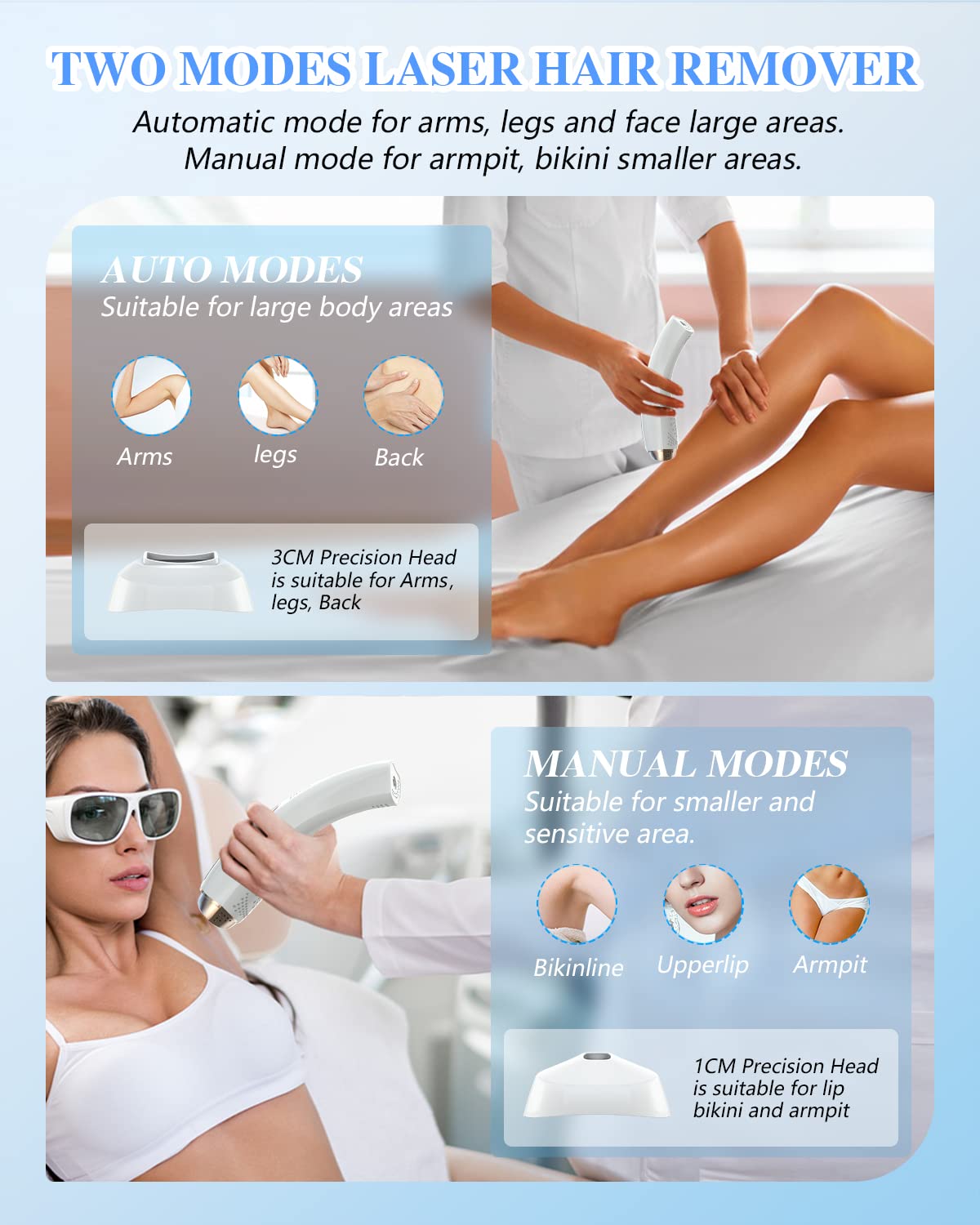 TWO MODES: Automatic mode is continuous flashing, it is easy control and for arms, legs and face large areas. Manual mode is single flashing, usually for lip hair, armpit hair, fingers, and bikini smaller areas.