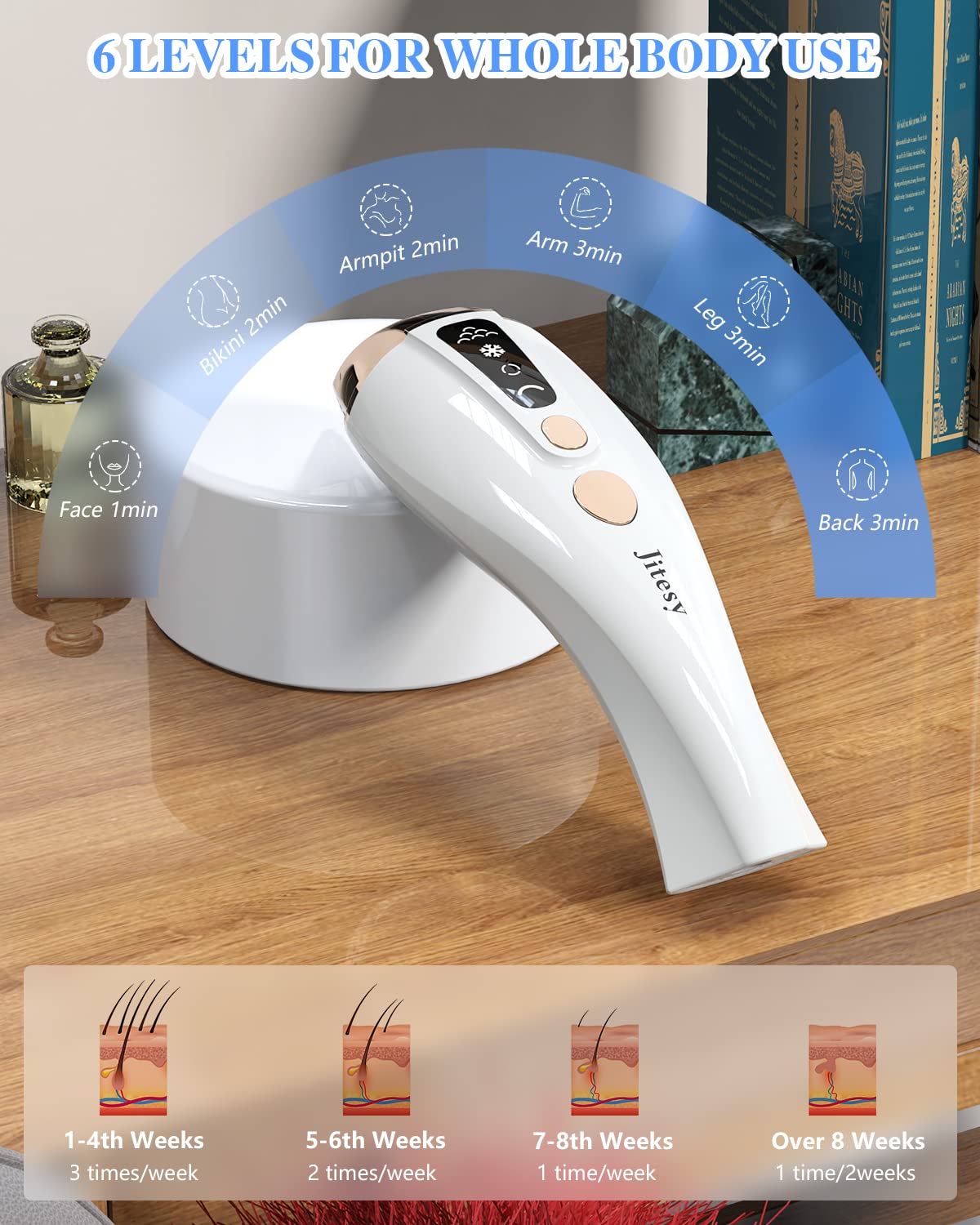 6 ENERGY STAGES: The hair removal device has 6 levels of energy stages, to meet different skin areas and different hair growth rates. The higher the stage, the higher the intensity, when using it for the first time, please use the lowest stage and gradually increase.