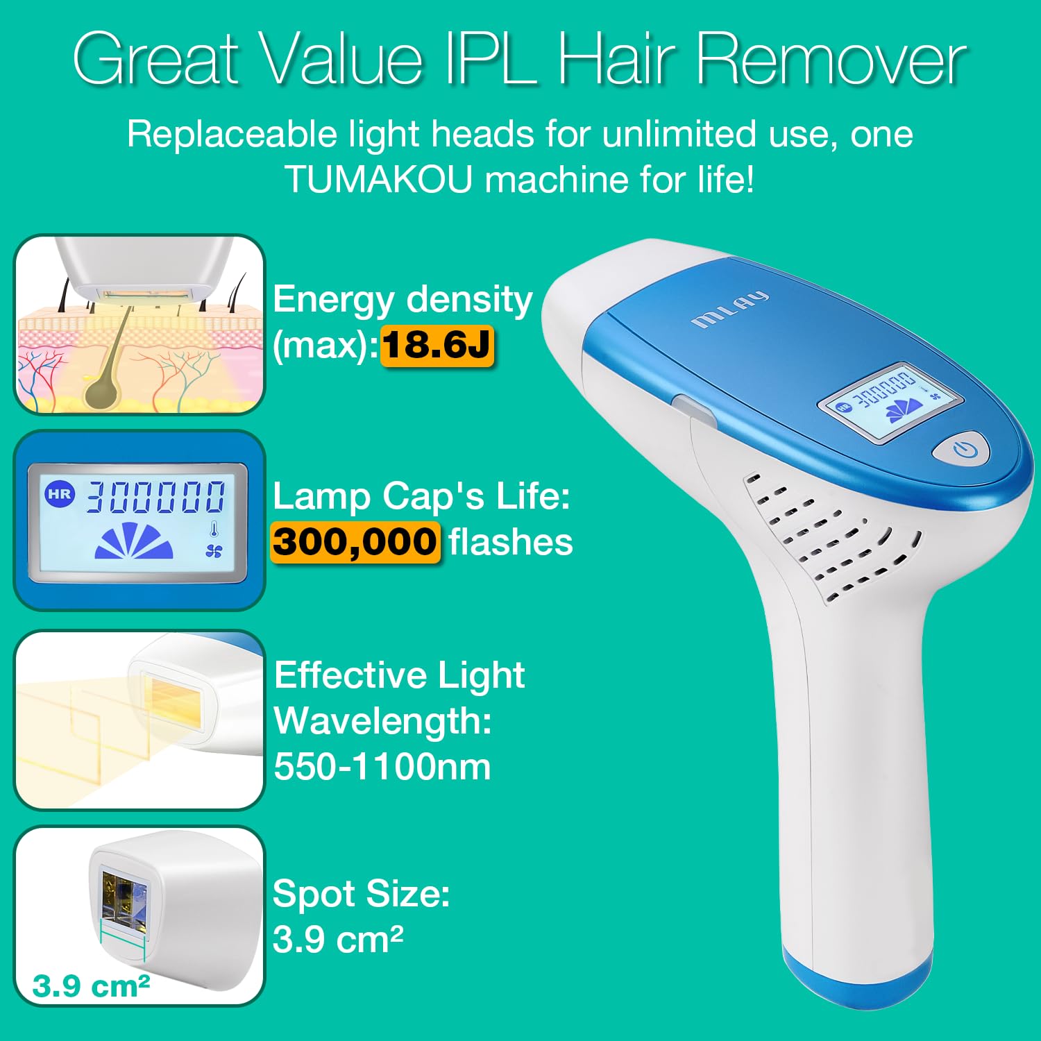 【SAFE IPL Hair Removal System】MLAY uses an innovative light-based technology called Intense Pulsed Light (IPL),derived from the technology used in professional beauty salons. IPL hair removal has been proved to be gentle, high safety, no side effects, painless hair removal method. 【Higher Energy Deliver to More Effective Results】12-18 joules of light energy makes the IPL hair remover more effective than other lower energy IPL hair removal machine. Thousands of real clinically proven results show that up to 93% hair reduction after 16-30 times complete treatment within 3-4 months. 【Perfect for Women and Men Body Hair Removal】The IPL hair removal device is perfect for both women and men. It is ideal for hair removal from the arms, face, armpits, bikini line, legs, back, chest. suitable for sensitive areas. NOTE: Not for use on red, white hair and black skin tones or tattoos or dark spots. 【Super Easy and Fast to Use】Hand-held home use hair remover is ergonomic designed, easy to carry. 300,000 flashes, LCD-Display. The IPL hair removal device has 3.9cm² size treatment window which enables fast treatment on the body at home. The permanent ipl hair removal system has five adjustable energy levels, increase level from 1 to 5 level gradually and choose the comfortable level according to your skin tone, to ensure gentle but effective treatment.