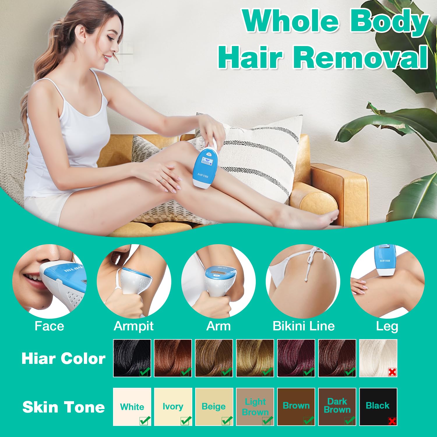 【Perfect for Women and Men Body Hair Removal】The hair removal device is perfect for both women and men. It is ideal for hair removal from the arms, face, armpits, bikini line, legs, back, chest. suitable for sensitive areas. NOTE: Not for use on red, white hair and black skin tones or tattoos or dark spots.