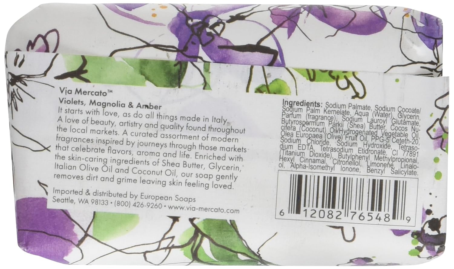 FRAGRANCE – Classic Floral (Violets, Magnolia & Amber); 200 gram bar enriched with the skin-caring ingredients of Shea Butter, Glycerin, Italian Olive Oil and Coconut Oil, our soap gently removes dirt and grime leaving skin feeling loved.
