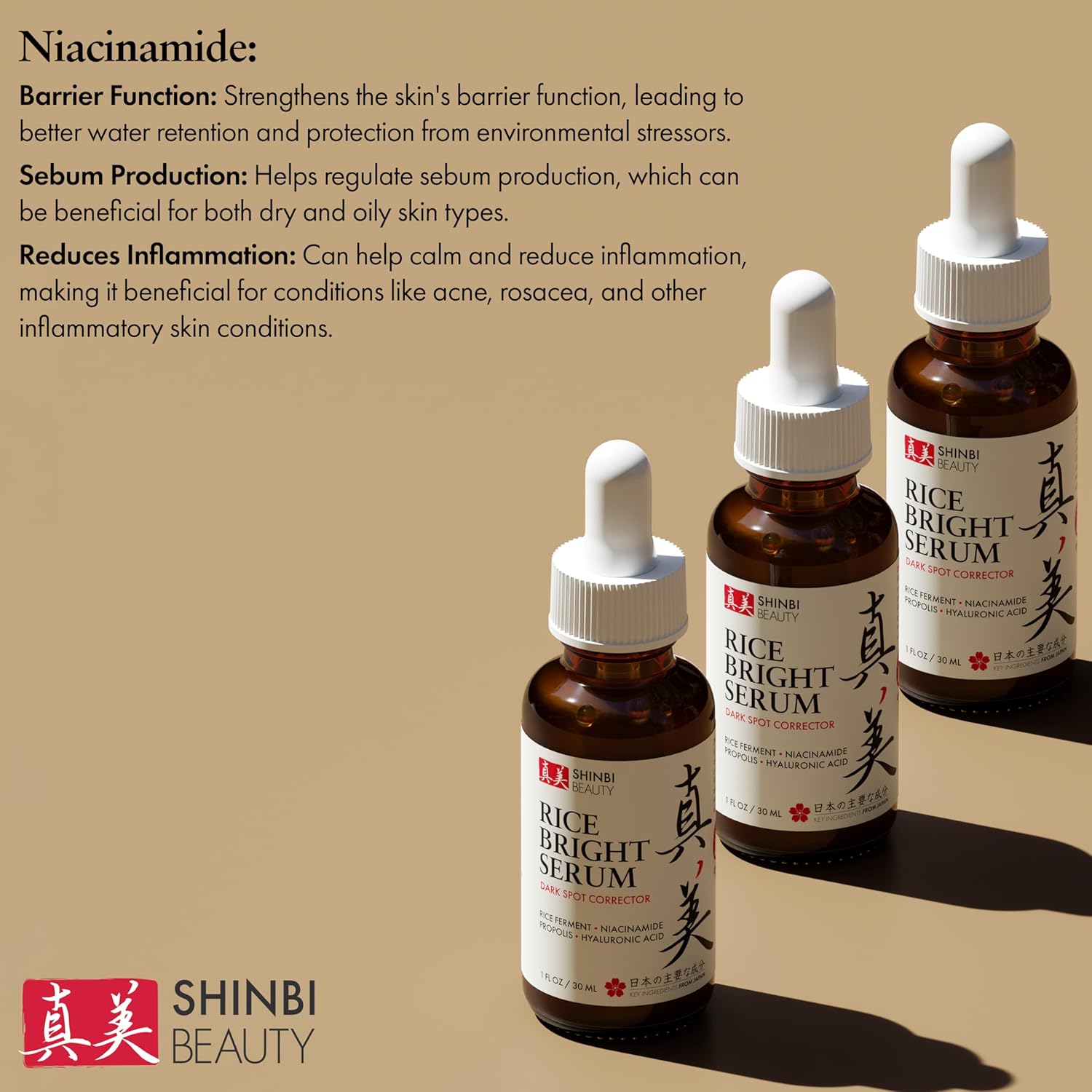 Shinbi Beauty’s Japanese Rice Bright Serum was developed to fade dark spots, hyperpigmentation and provide you brightened skin and an even skin tone. We’ve taken the essence of time-honored Japanese beauty secrets and transformed it into an extremely effective dark spot corrector / brightening serum by combining 5% niacinamide, fermented rice, propolis and hyaluronic acid, for Gukujun Asian skincare products that truly work.