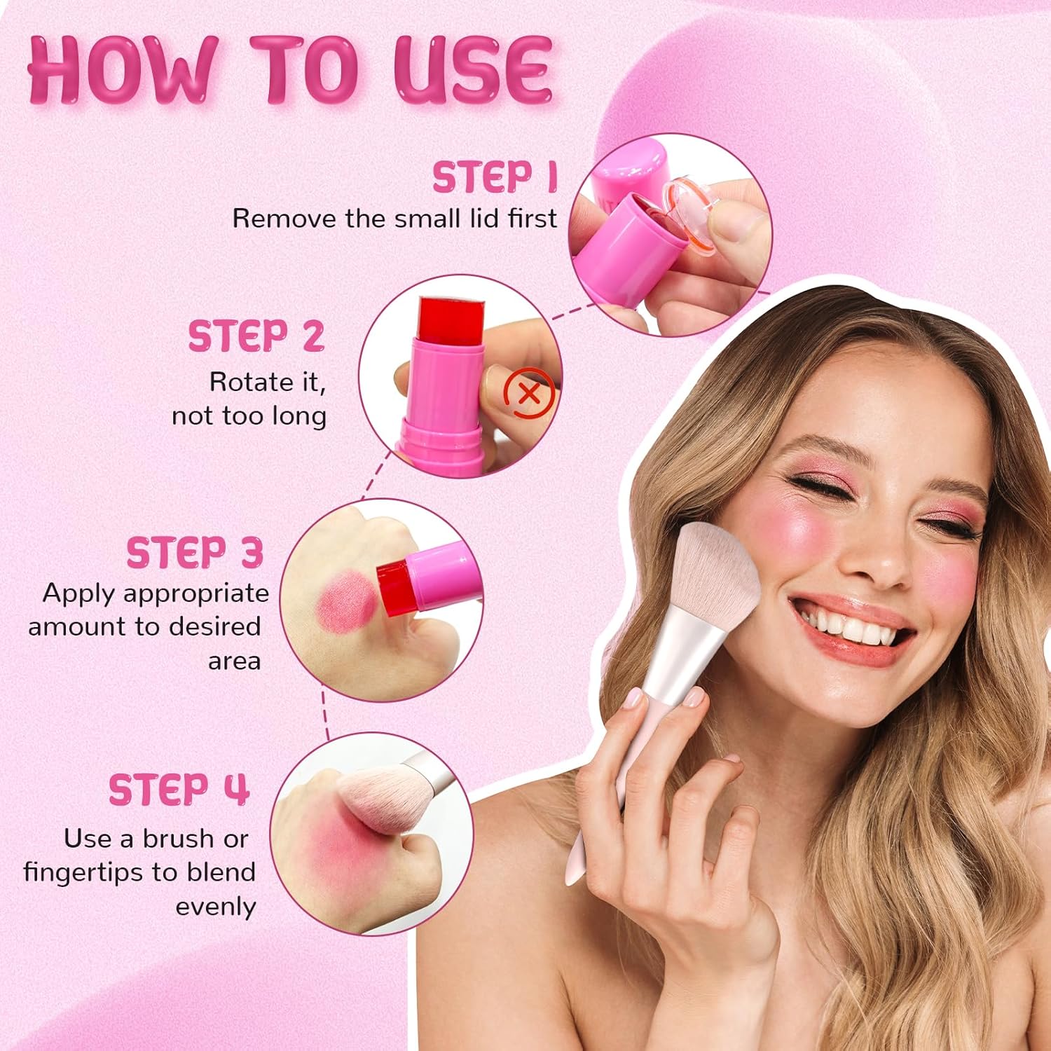 🔥【HOW TO USE】- First, remove the inner and outer lids and rotate it to a suitable length (avoid more than 1/2 of the remaining length). Then, apply gently to your cheeks, lips or eyes, and finally apply evenly with a brush or fingertips quickly.