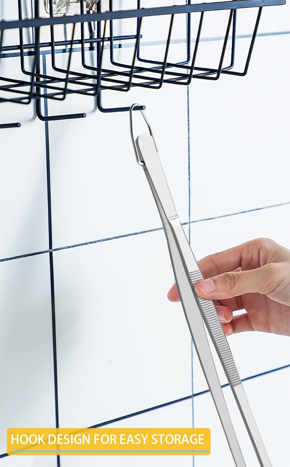 ✅【Ergonomic Design】- These tweezers design with comfortable ergonomic shape, precision tweezer food tongs to protect your movements. The tip of the cooking tweezers is slender and easy to hold and extend into a narrow space. The hook design at the rear makes it easy to store and hang in any corner of the kitchen.