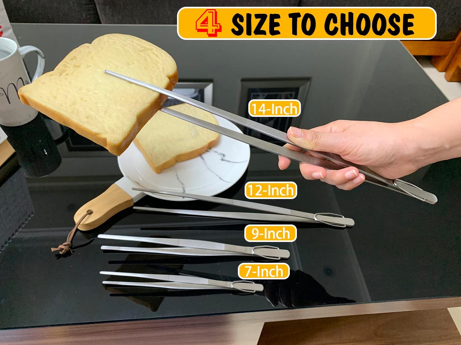 ✅【Perfect Tweezer Style Tongs for Various Goodies】- These precision food tweezers (Silver) are comes with 3 size, 9-inch (23.3cm), 12-inch (30.5cm), 14-inch (35.6cm). Different sizes can meet daily use, they’re not just for serving appetizers, meat, steak, bread, salad, cookies, fried, hot dog, spaghetti, buffet, bbq, baking and so on. Even can be used for feeding small animals, cleaning out a garden or fish tank, plant maintenance.