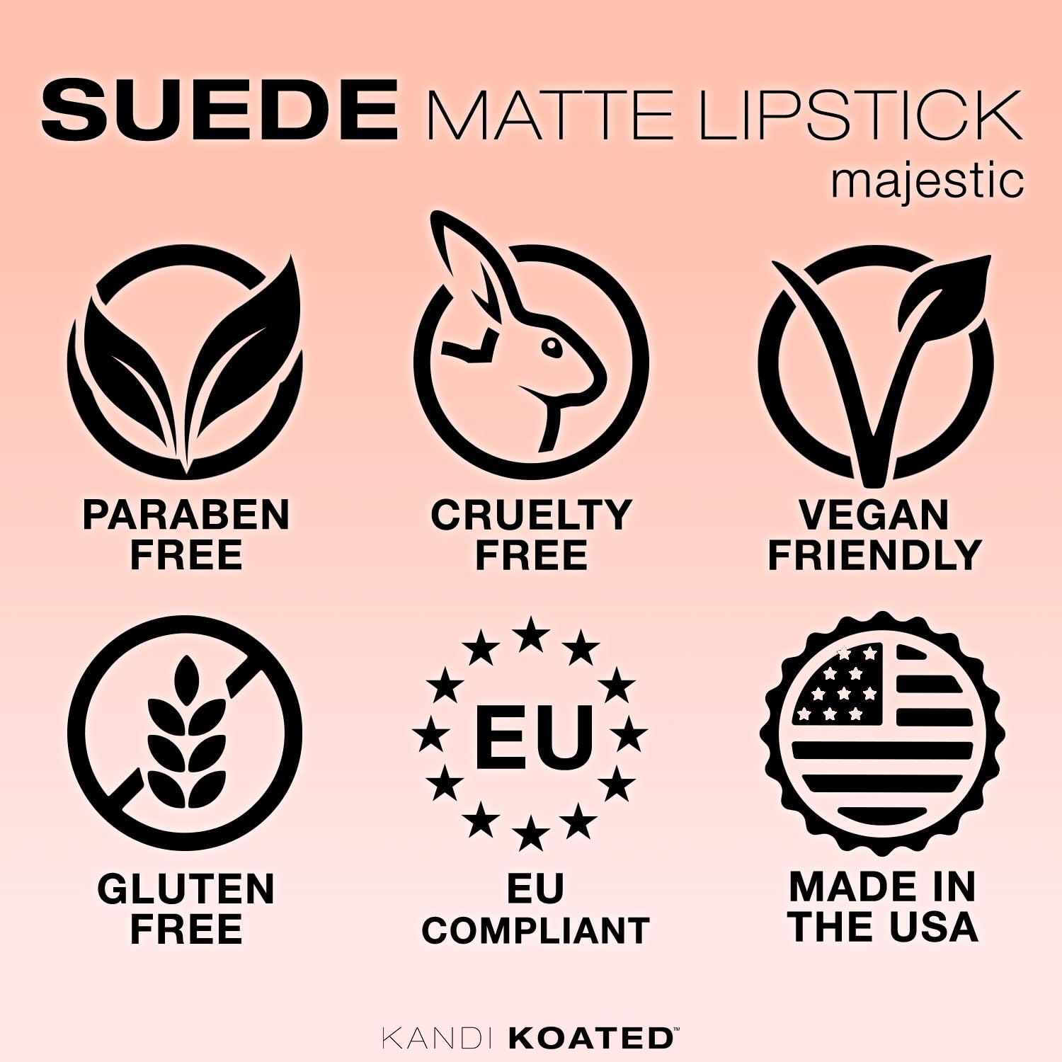 Vibrant Matte Color: Kandi Koated Suede Matte Lipstick in Majestic offers rich, intense matte color, ensuring your lips command attention with a flirty and rich warm purple hue.