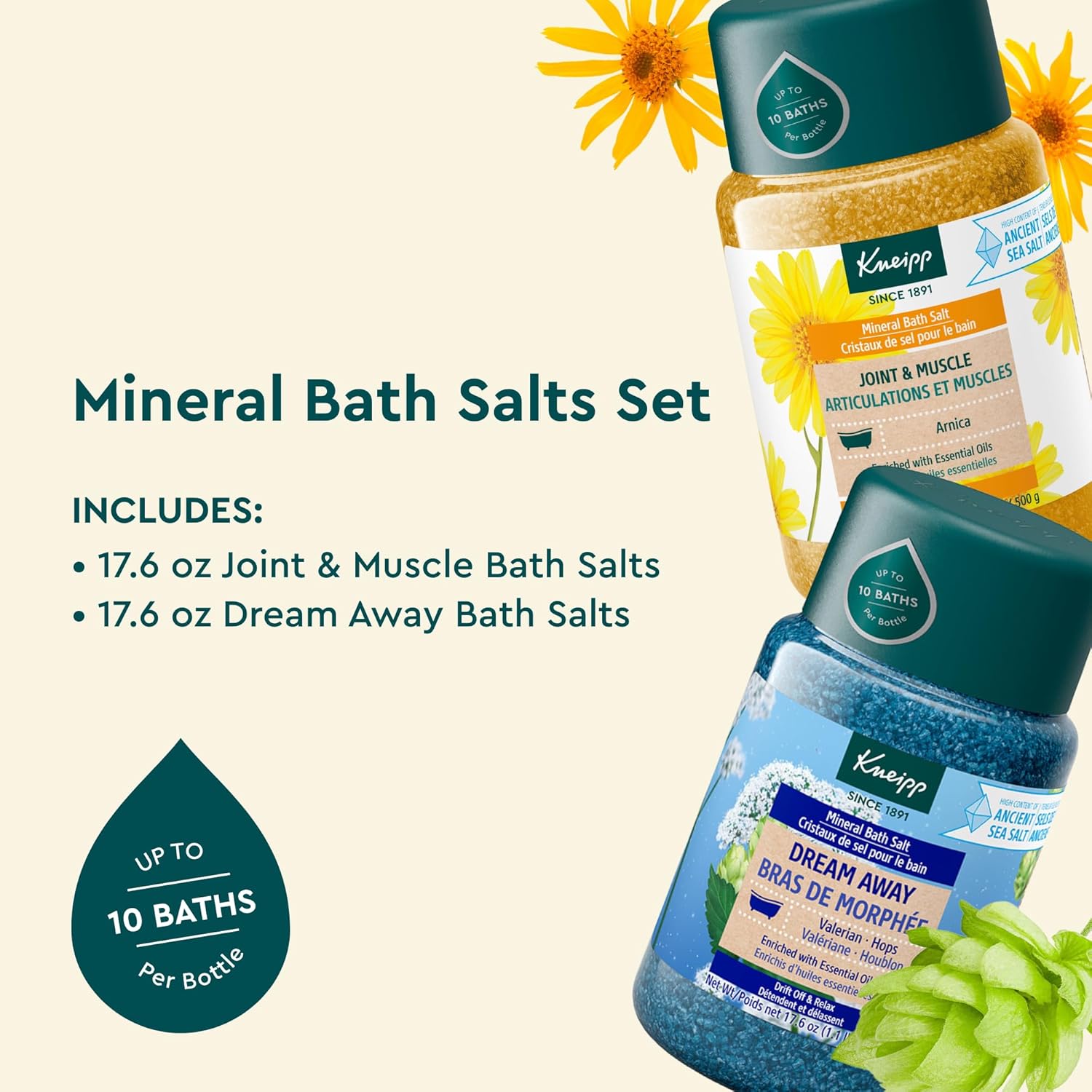 Kneipp Joint & Muscle Mineral Bath Salt with Arnica (17.6 oz) + Dream Away Mineral Bath Salt with Valerian & Hops (17.6 oz)