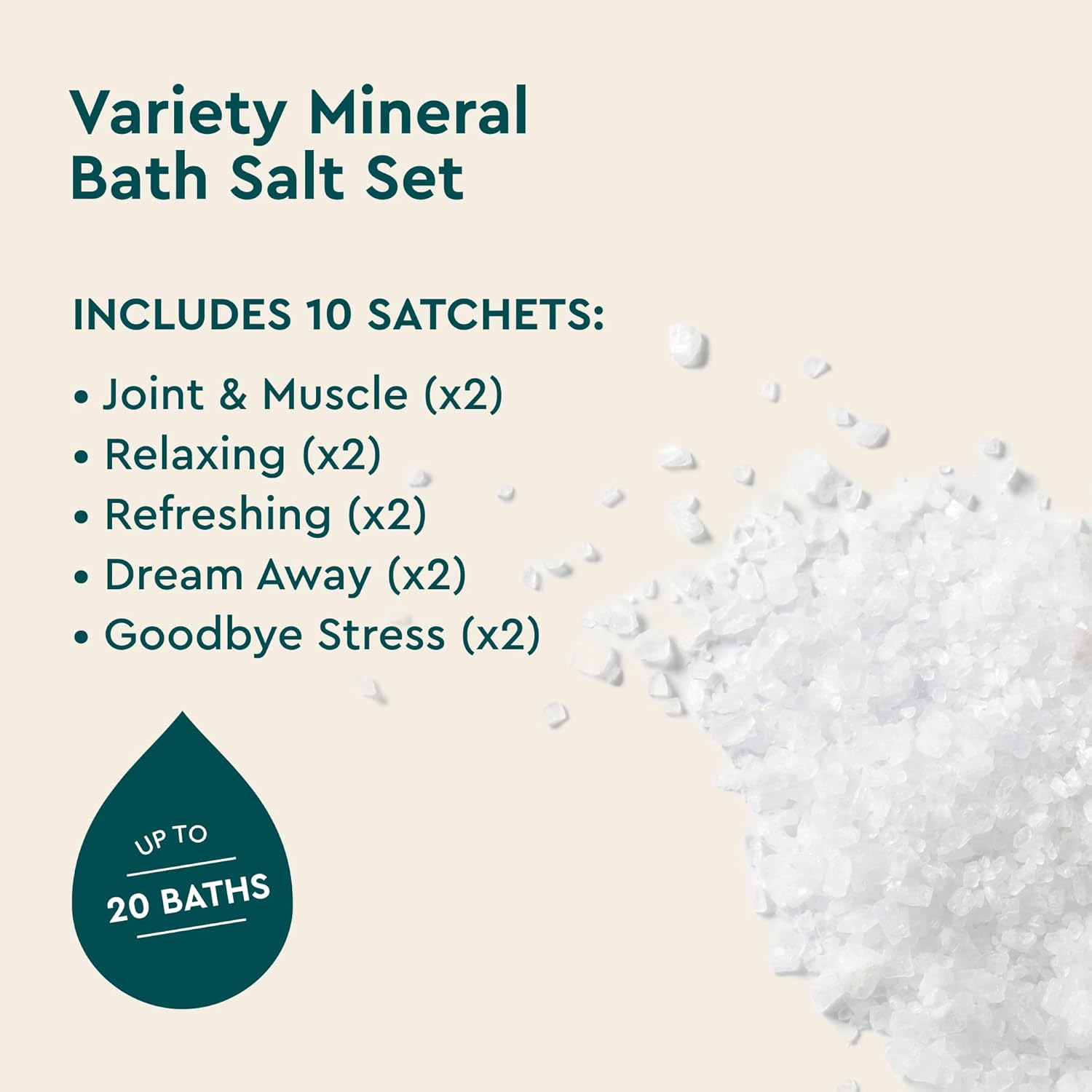 WHAT’S INCLUDED: This variety pack includes mini sizes of the following bath salts: Joint & Muscle, Relaxing, Under the Weather, Dream Away, and Goodbye Stress.