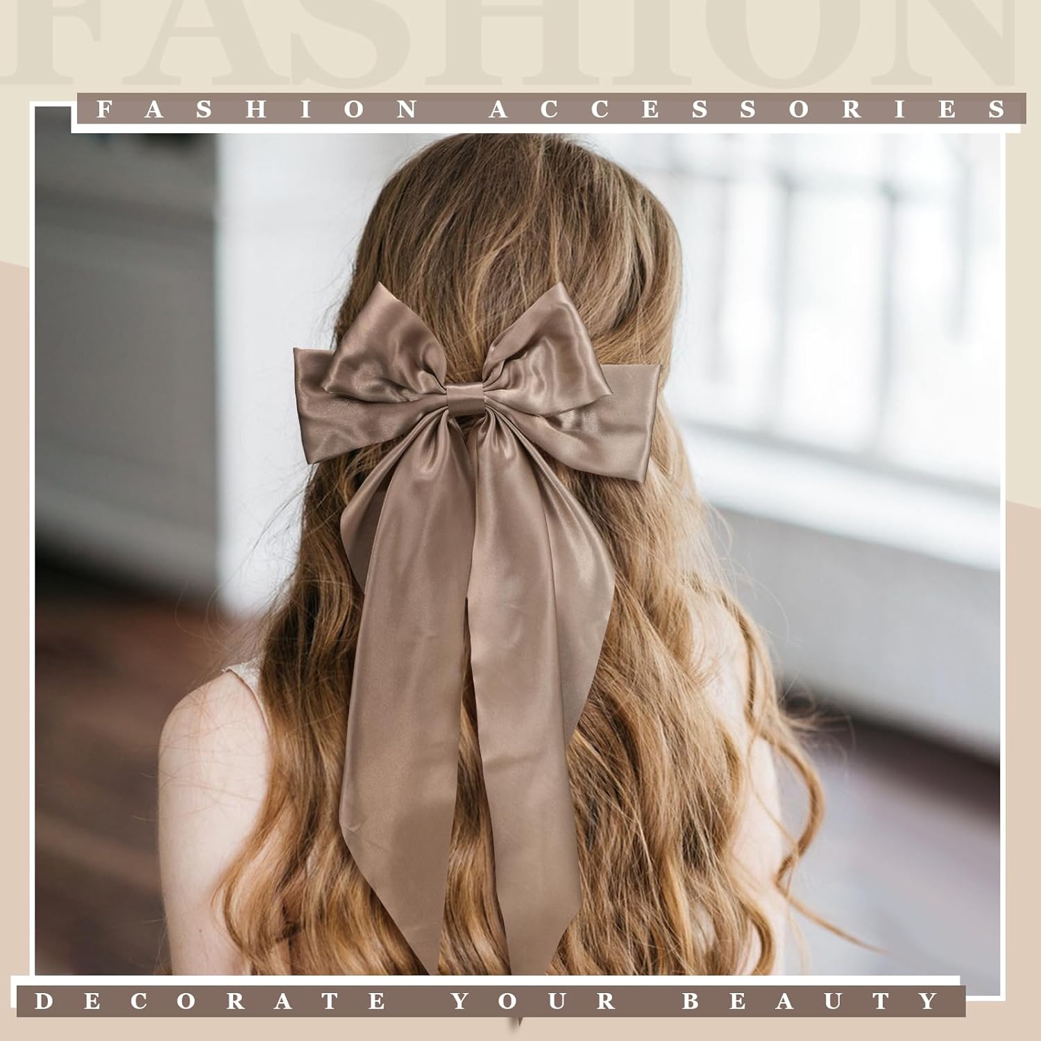 Large Hair Bows for Women, 5 Pcs Satin Hair Ribbons Bow Hair Clips, Oversized Long Tail Hair Bow Neutral Color Hair Bows Hair Barrettes Cute Hair Accessories for Girls
