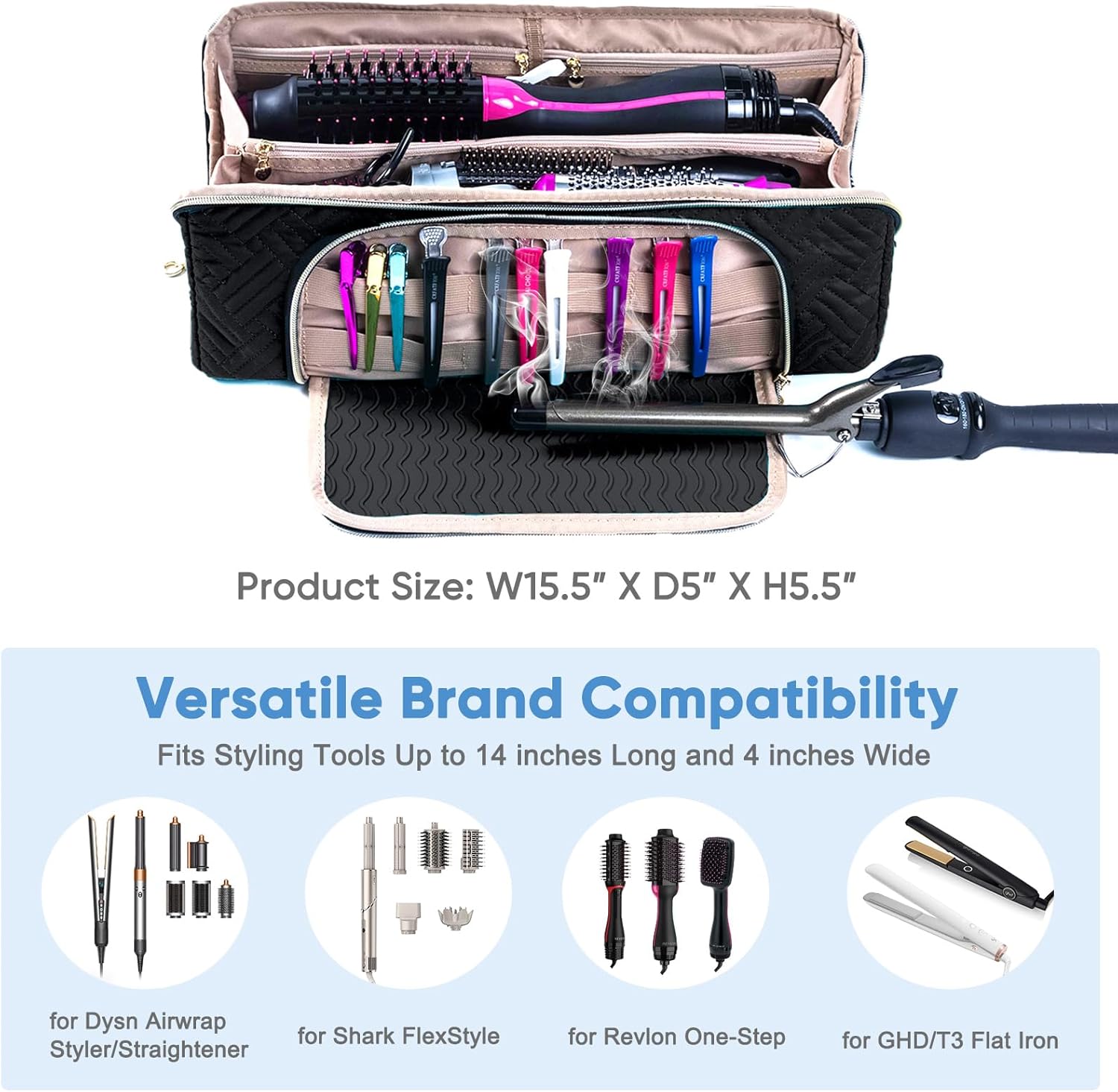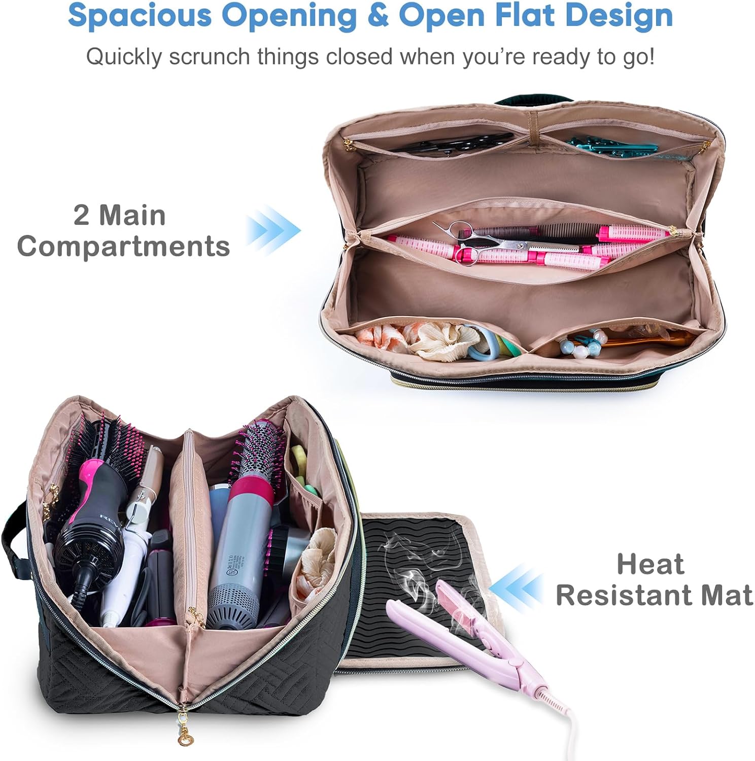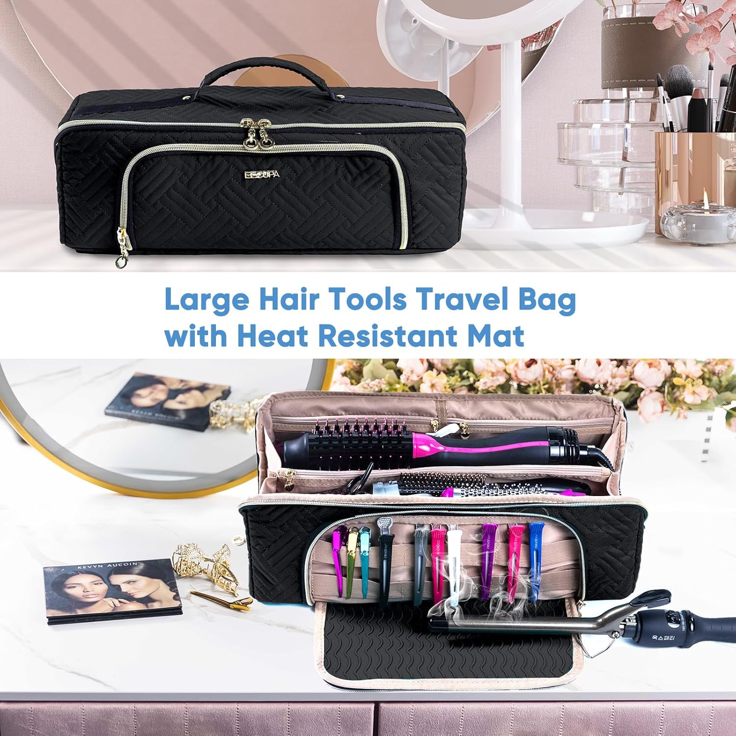 Large Hair Tools Travel Bag with Iron Mat – 2in1 Hair Tools Organizer for Hair Dryer Brush, Flat Irons, Straighteners, Curling Irons, Hair Bag, Makeup Bag, Cosmetic Bag for Travel Essentials