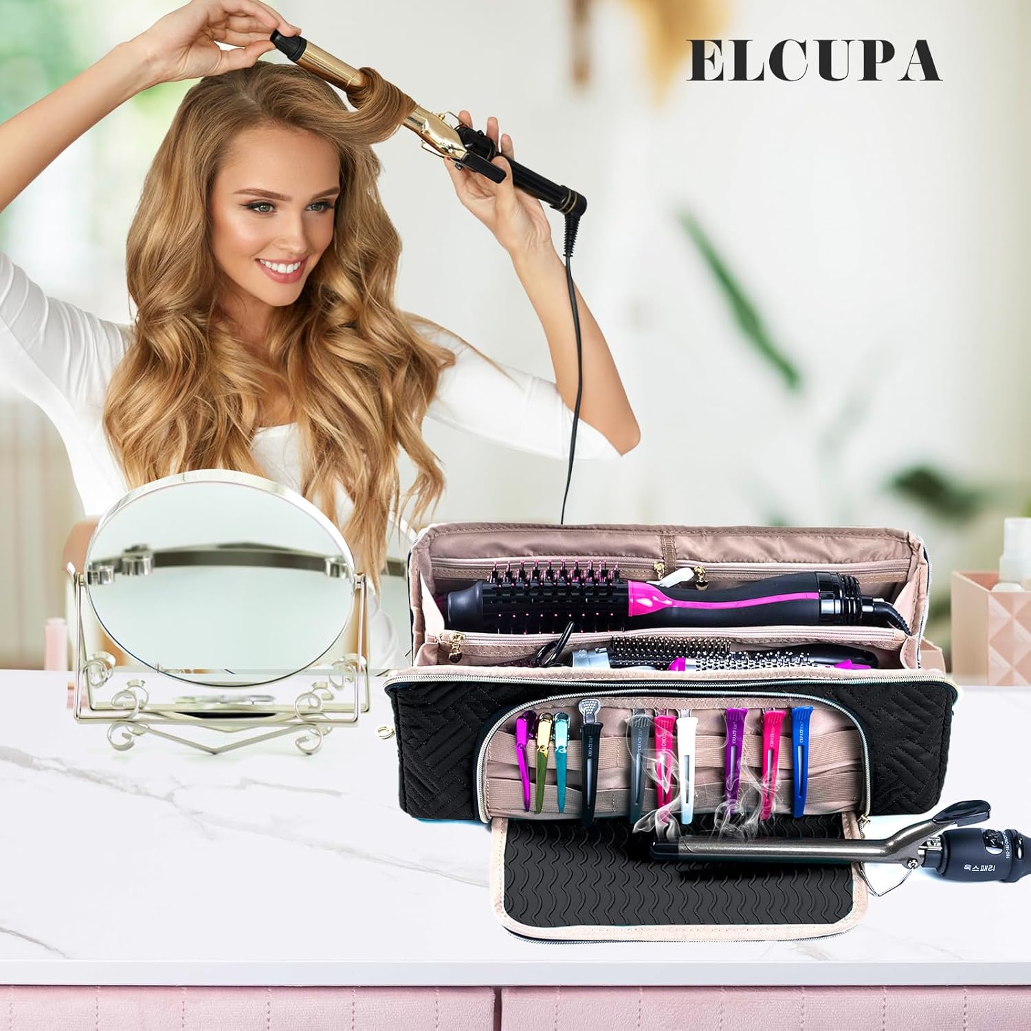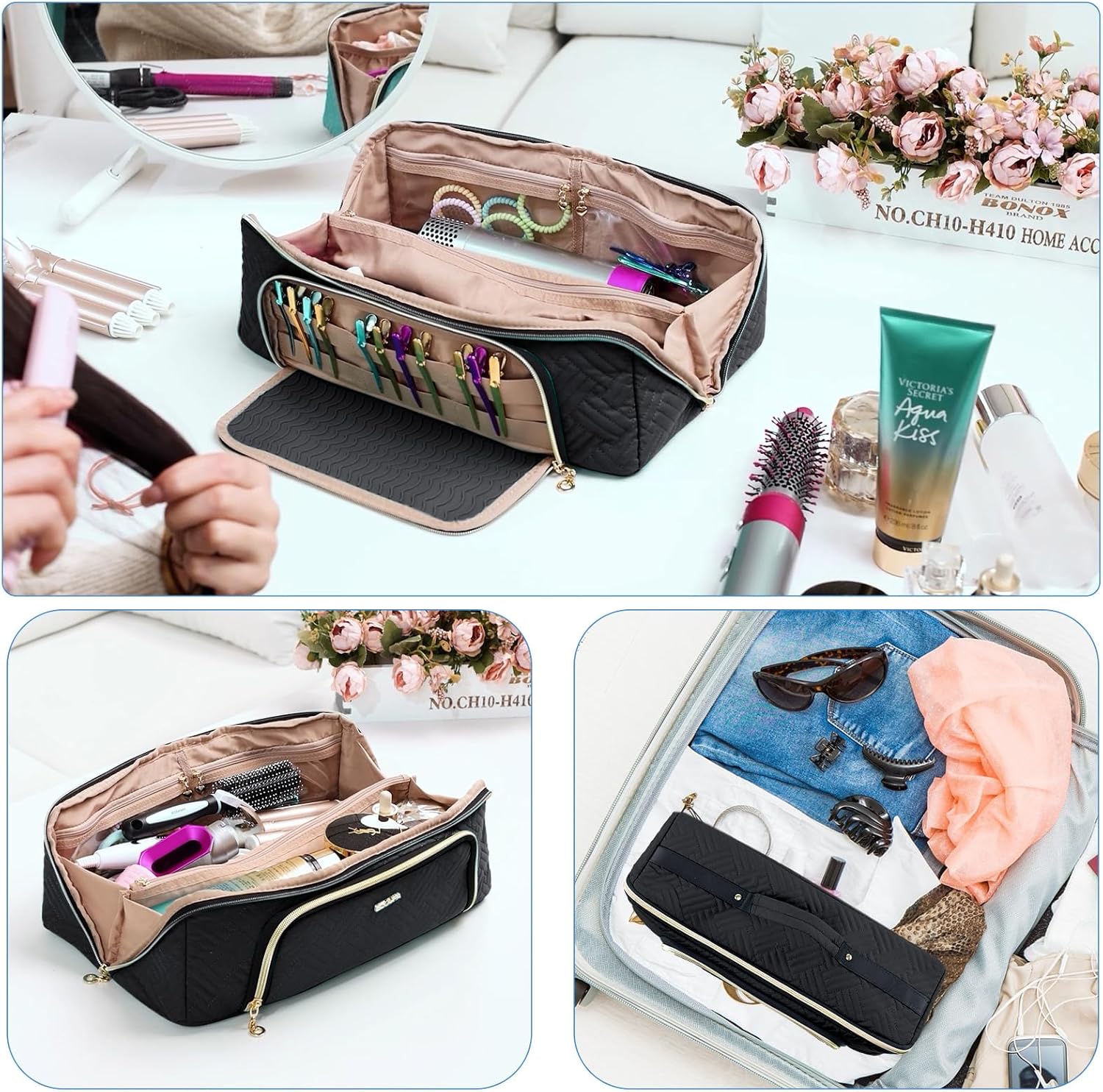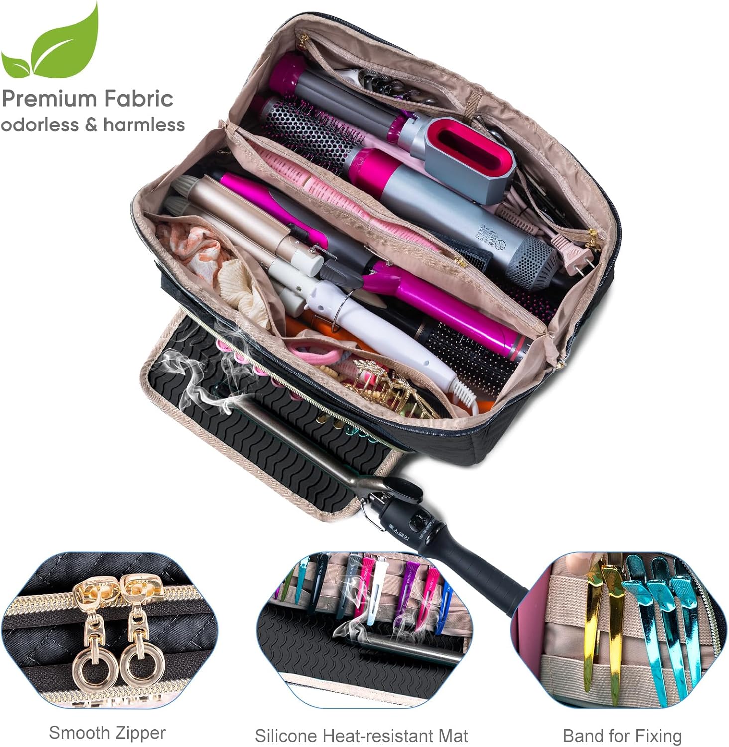 Large Hair Tools Travel Bag with Iron Mat – 2in1 Hair Tools Organizer for Hair Dryer Brush, Flat Irons, Straighteners, Curling Irons, Hair Bag, Makeup Bag, Cosmetic Bag for Travel Essentials