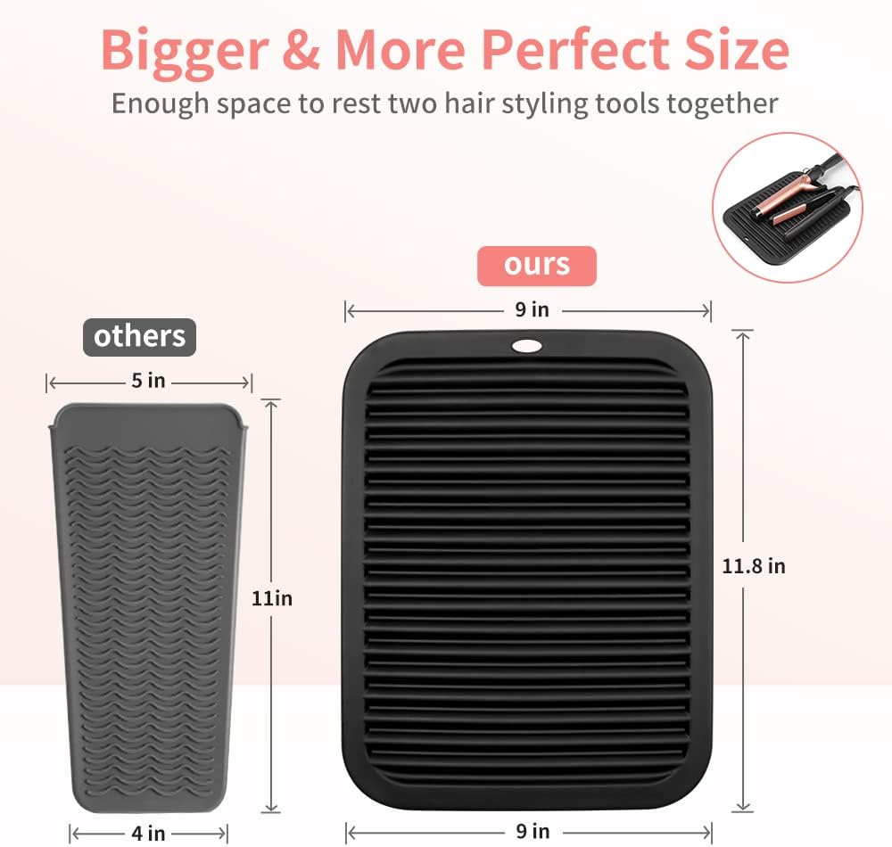 Larger Size Larger Space – The hair tools mat is designed as 11.8*9.1*0.24 inches, weight 0.33lb. This curling iron mat heat resistant for counter can place multiple hair styling tools at the same time. This item only includes a heat resistant mat.