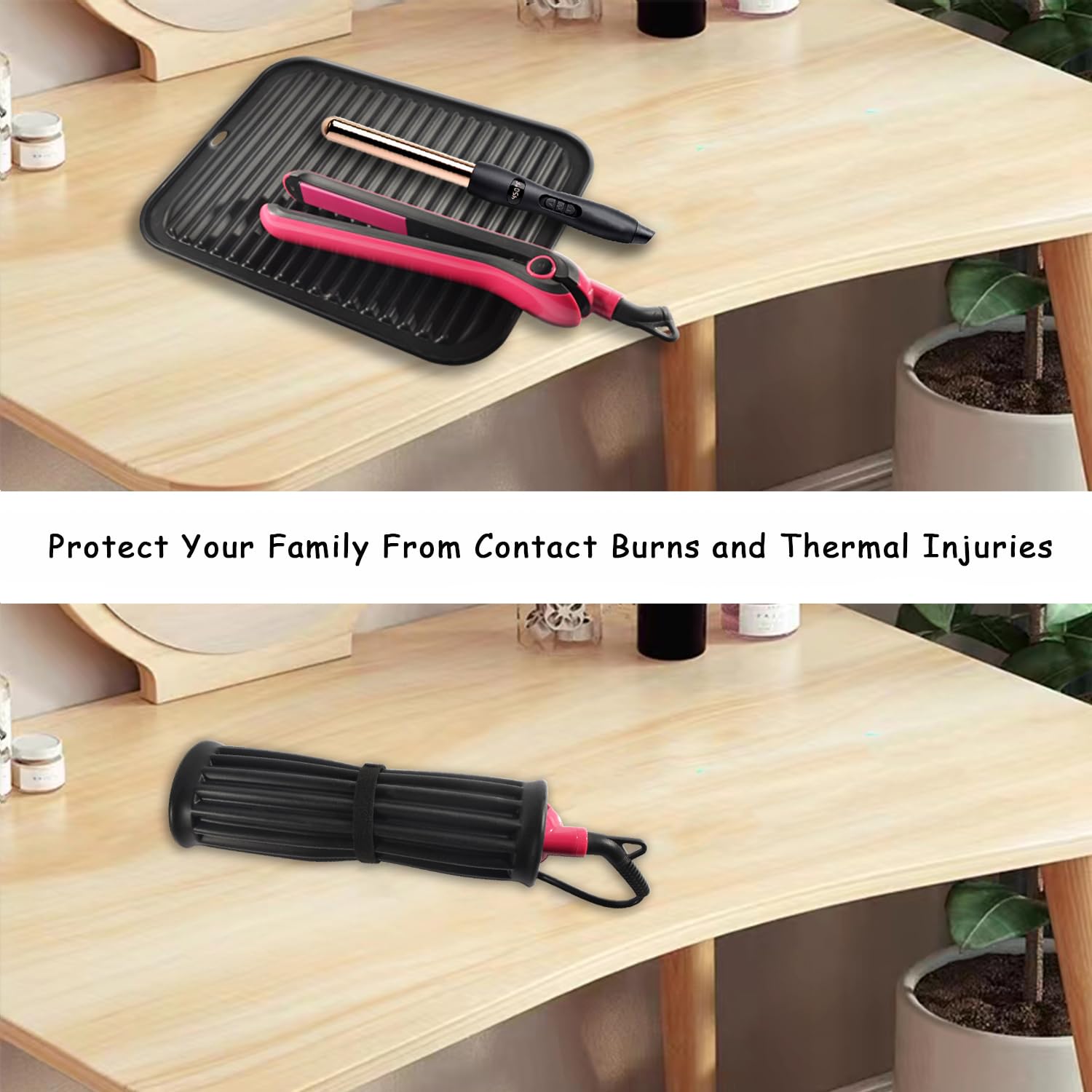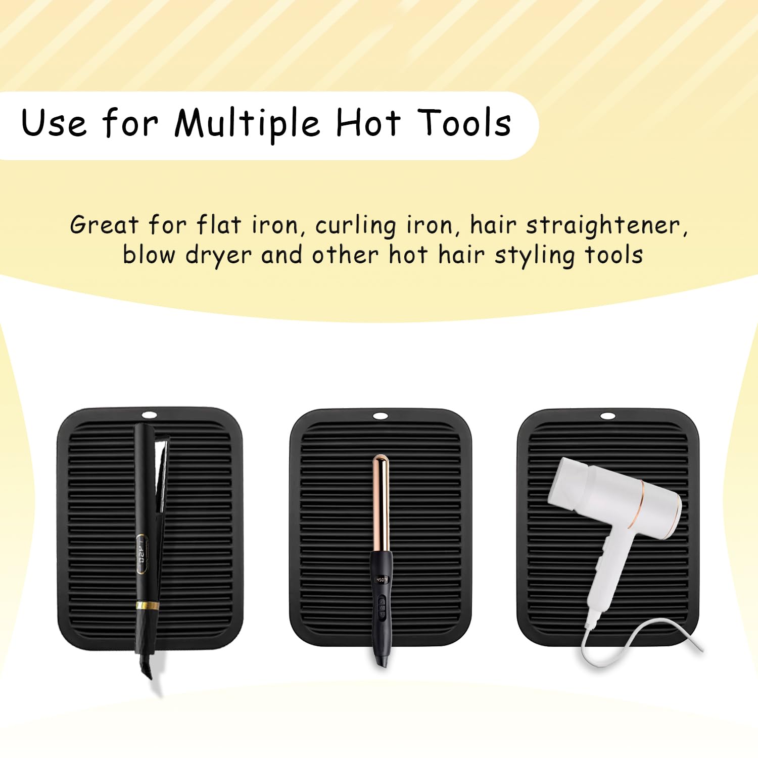 This silicone heat resistant mat for hair tools safeguards countertops and furniture from heat damage of flat iron, curling iron, hair straightener, blow dryer, hair curlers and other hot hair styling appliances. Perfect for home, travel, and hair salons.