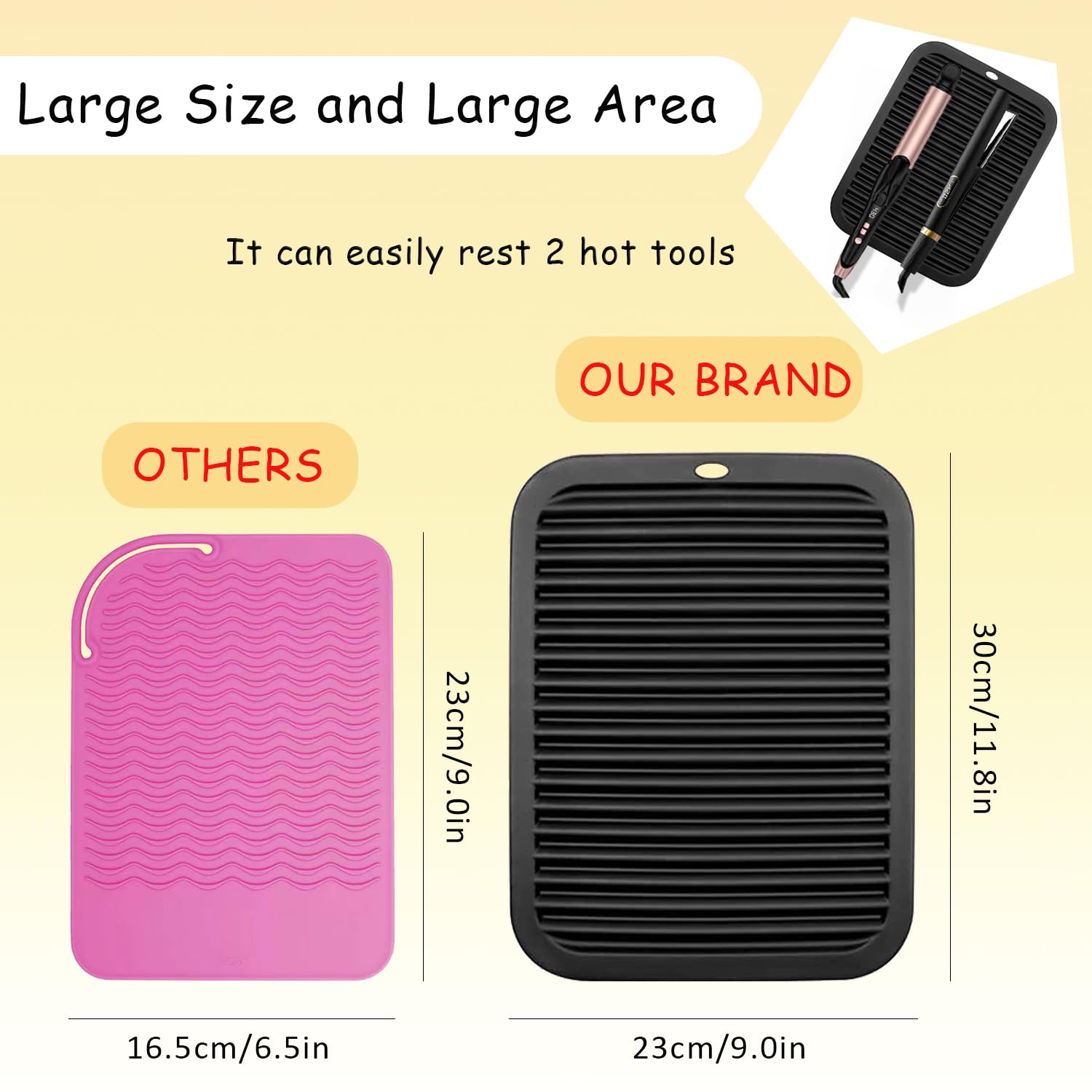 Large Size Design – Our hot tools mat size is 11.8*9.0*0.24 inches and weighs 0.33 lb, a larger size than traditional silicone mats, multiple hot hair tools can be placed at the same time. The raised textured allows for a firm grip on the hair tool without slipping.