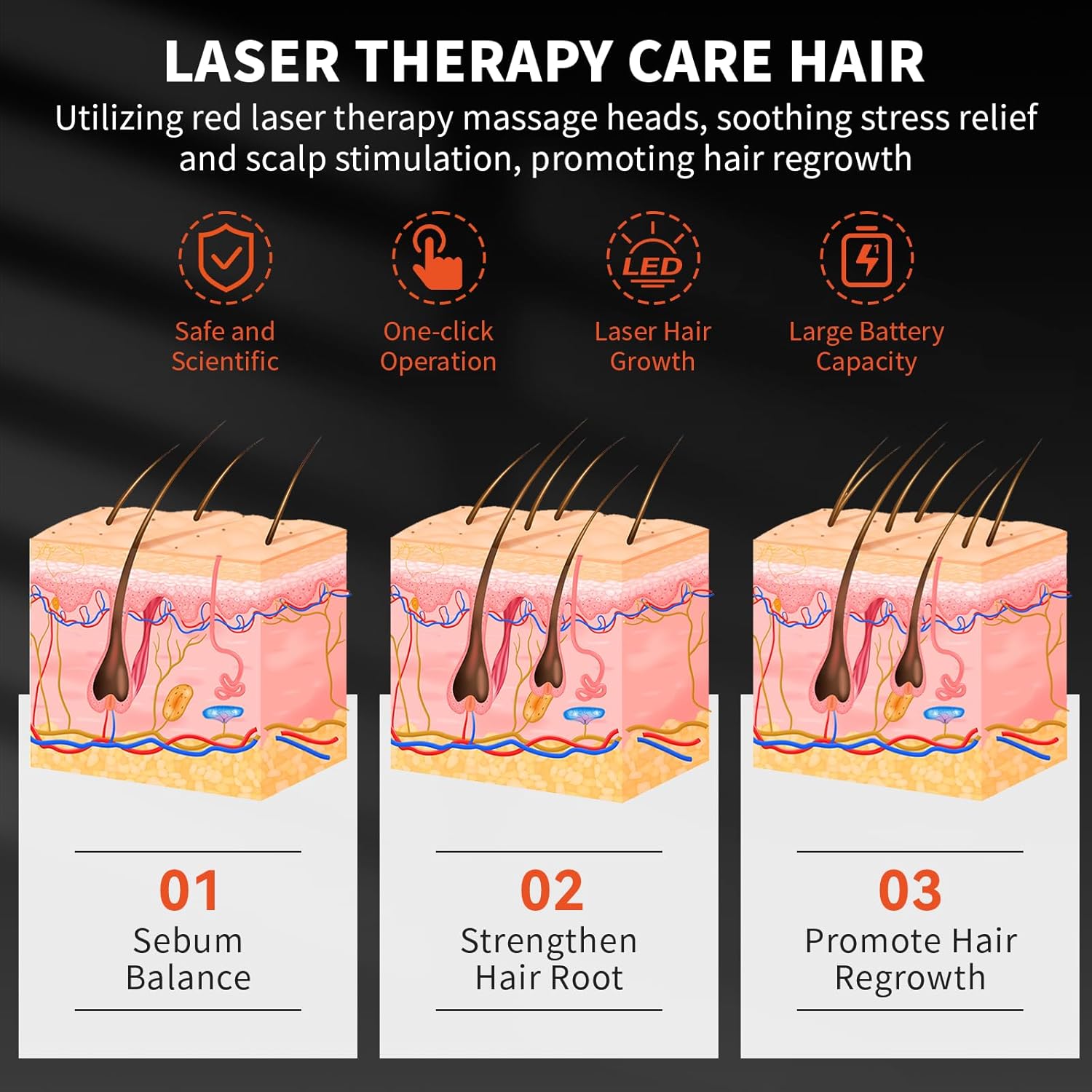 【Easy to Use】Laser Therapy Hair Growth Comb is a hand-held comb-shaped low-level laser therapy device that emits laser light designed to promote hair growth in women and men. The device provides distributed laser light to the scalp while the comb teeth simultaneously part the user’s hair to ensure the laser light reaches the user’s scalp. One-button operation for convenient use, Hand shank for comfortable holding